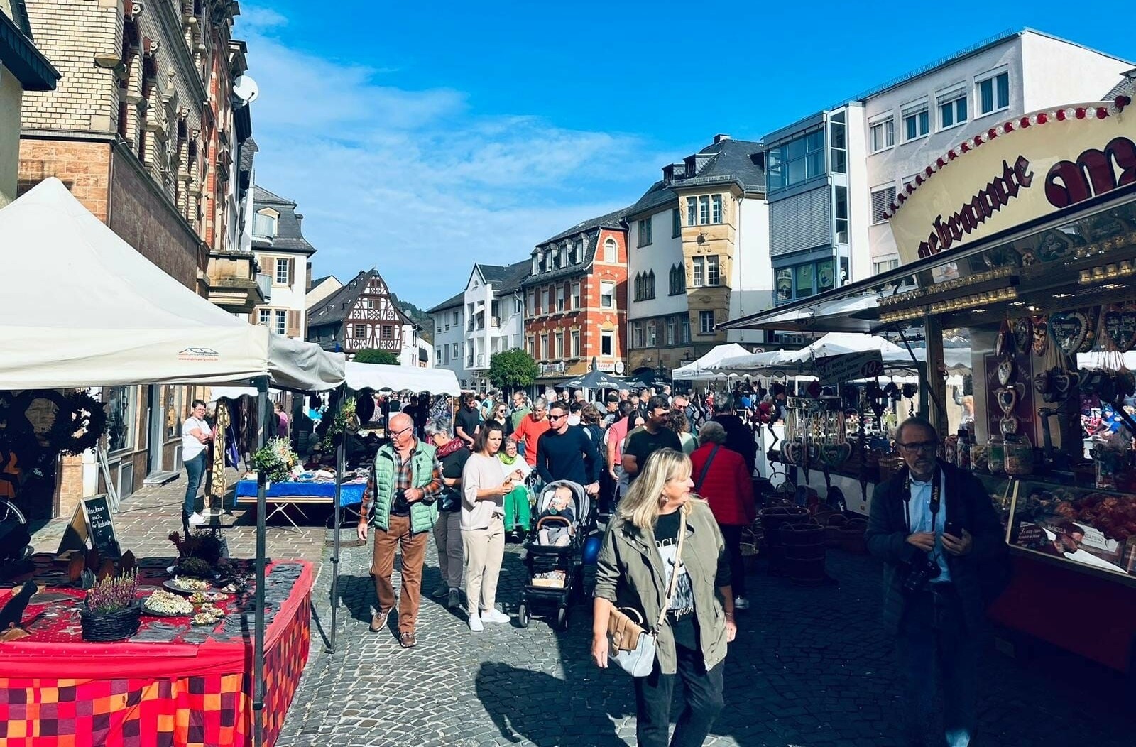 Dank des erneuten Wetterglücks platzte die Kirner Innenstadt am Sonntag beim Kunsthandwerker- und Bauernmarkt aus allen Nähten. Pünktlich um 11 Uhr eröffneten Verbandsgemeinde-Bürgermeister Thomas Jung, Stadtbürgermeister Frank Ensminger, Gunnar Venter und Cornelia Dhonau-Wehner von der Werbegemeinschaft »Klar« und Moderator Andreas Heck die diesjährige Auflage. Die Auswahl an Dekorationsartikeln, Textilien und Pflanzen war bei rund 70 Ausstellern sehr groß, zahlreiche Familien machten auch vom umfangreichen kulinarischen Angebot des Markts Gebrauch und verlegten ihr Mittagessen kurzerhand in die Innenstadt: Die Kirner Feuerwehr um ihren Wehrführer Markus Späth hatte im Gerätehaus ein großes Kuchenbüfett vorbereitet, Melanie Jung mit ihrem AWO-Team verwöhnte die Besucher mit deftigen gefüllten Klößen, die Reservisten des Kirner Landes bereiteten in der Feldküche ihre beliebte Erbsensuppe vor, und die Pfadfinder aus Kirn Sulzbach hatten bereits gegen 14 Uhr ihre 25 Kilo (!) Reibekuchen ausverkauft. Markmeister Luca Schallmo und Cathrin Endres (Wirtschaftsförderung VG Kirner Land) freuten sich über die große Resonanz und den rundum gelungenen Sonntag.