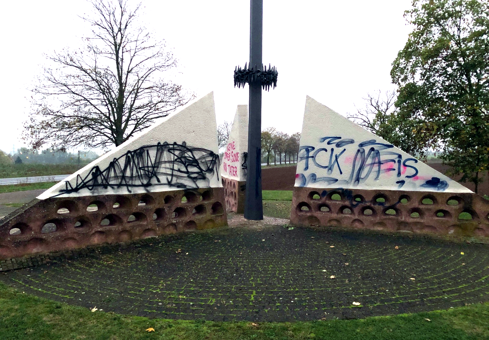Durch einen Funkstreifenwagen der Polizei Bad Kreuznach wurden heute (1. November) in den frühen Morgenstunden gegen 7 Uhr Farbschmierereien am Mahnmal "Feld des Jammers" an der Bundesstraße zwischen Bad Kreuznach und Bretzenheim entdeckt. Die Täter beschädigten zudem eine Blumenschale und ein Gedenkkranz. Tatzeitraum war aller Wahrscheinlichkeit nach die vergangene (Halloween)-Nacht. Derzeit liegen keine Hinweise auf den oder die Täter vor. Ein Strafverfahren gegen Unbekannt wurde eingeleitet. Hinweise auf Personen oder Fahrzeuge, die sich in der Nacht vom 31.10.2019 auf den 01.11.2019 verdächtig im Bereich des Mahnmals aufgehalten haben, nimmt die Polizei Bad Kreuznach über Telefon 0671-8811101 oder 0671-8811100 entgegen. Das Mahnmahl "Feld des Jammers" erinnert an ein ehemaliges großes Kriegsgefangenenlager, das zur Gruppe der Rheinwiesenlager gehörte und gegen Ende des Zweiten Weltkrieges auf den Gemarkungen der Orte Winzenheim und Bretzenheim in der Nähe von Bad Kreuznach eingerichtet wurde. Es war zeitweise mit bis zu 100.000 Gefangenen belegt.