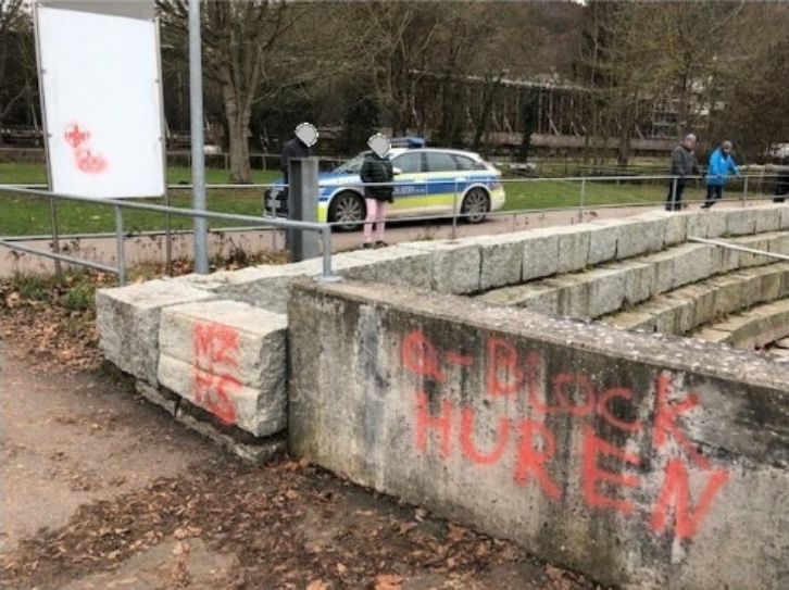 Unbekannte haben die Mauer an der Kanu-Wettkampfstrecke im Salinental mit einem Graffiti besprüht. Die Polizei fand dort und in der mittleren Unterführung einer Saline zudem weitere älter wirkende Schmierereien, darunter auch Logos von Fußballfans.