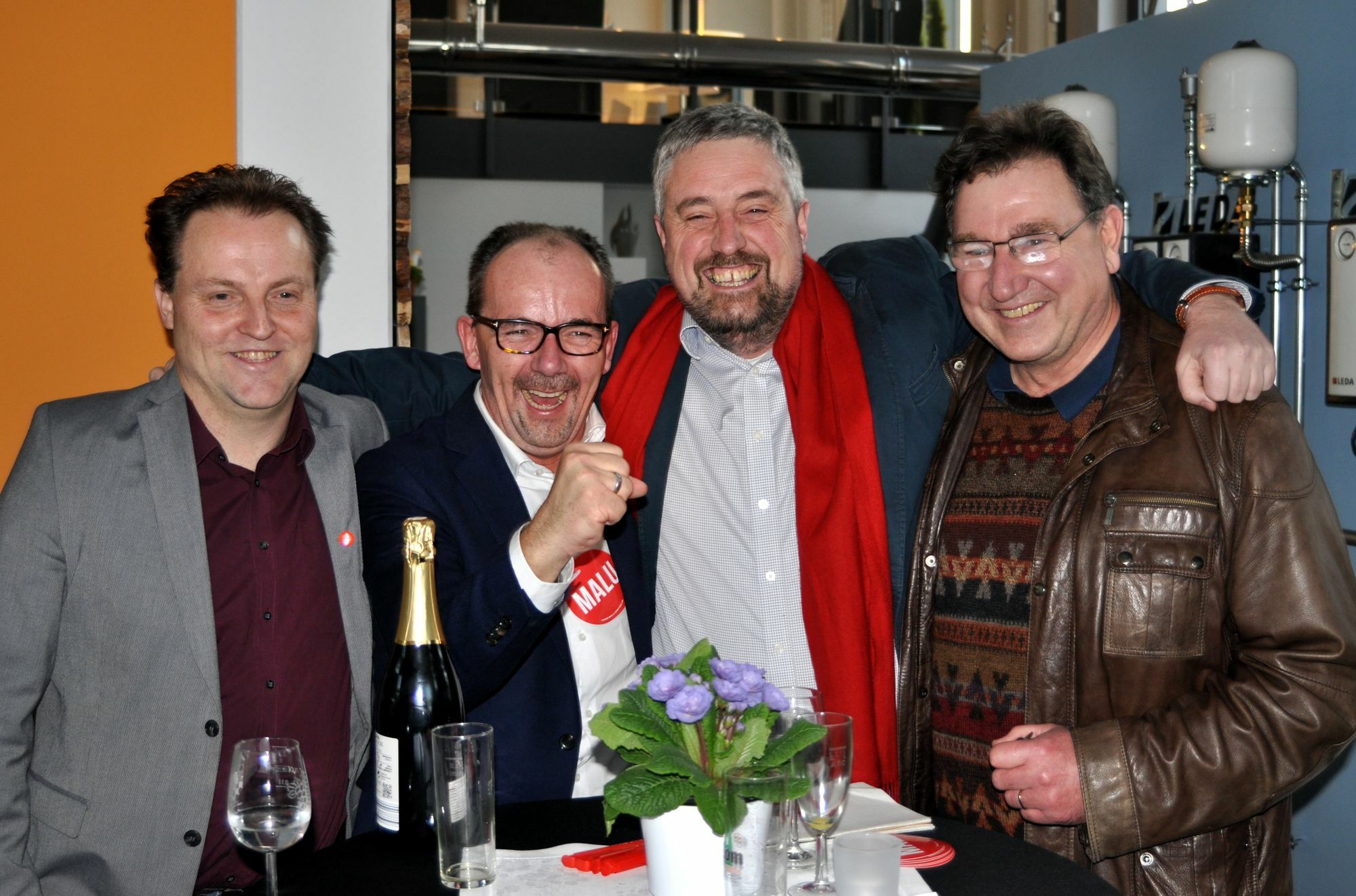 "Das ist einfach fantastisch", freut sich Michael Simon, Direktkandidat der SPD im Wahlkreis 17 (Bad Kreuznach). Mit einem Kopf-an-Kopf-Rennen mit der CDU habe er gerechnet - aus dem die SPD dann mit hauchdünner Mehrheit als Sieger hervorgehe. "Das der Vorsprung vor der CDU nun so deutlich ist, das hätte ich nie erwartet", so Simon, der gleich anfügt: "Das schafft keiner allein. Das ist der Lohn der solidarischen Arbeit aller Genossinnen und Genossen und der Lohn eines tollen Wahlkampfes von Ministerpräsidentin Malu Dreyer." Auch der SPD-Stadtverbandsvorsitzende Günter Meurer freut sich riesig über den Wahlerfolg: "Dieser Erfolg ist ein klares Bekenntnis der Leute, was sie wollen: Zuverlässigkeit, Glaubwürdigkeit, Sachlichkeit und eine authentische Ministerpräsidentin. Die Menschen wollen Malu Dreyer wieder haben." Für CDU-Landeschefin Julia Klöckner sei es eine schwere Schlappe, dass die CDU nicht stärkste Partei geworden sei. Bedenklich sei das starke Abschneiden der AfD: "Alle demokratischen Parteien müssen sich nun fragen, wie wir damit umgehen und wie wir den Ruck nach rechts ändern", so Maurer. Foto: Bejubeln den Erfolg (v. l.): SPD-Direktkandidat Michael Simon, SPD-Stadtverbandvorsitzende Günter Meurer, der erste Kreisbeigeordneter Hans-Dirk Nies und Dr. Heinz Rübbel, SPD-B-Kandidat im Wahlkreis 17. Text & Foto: Kai Brückner