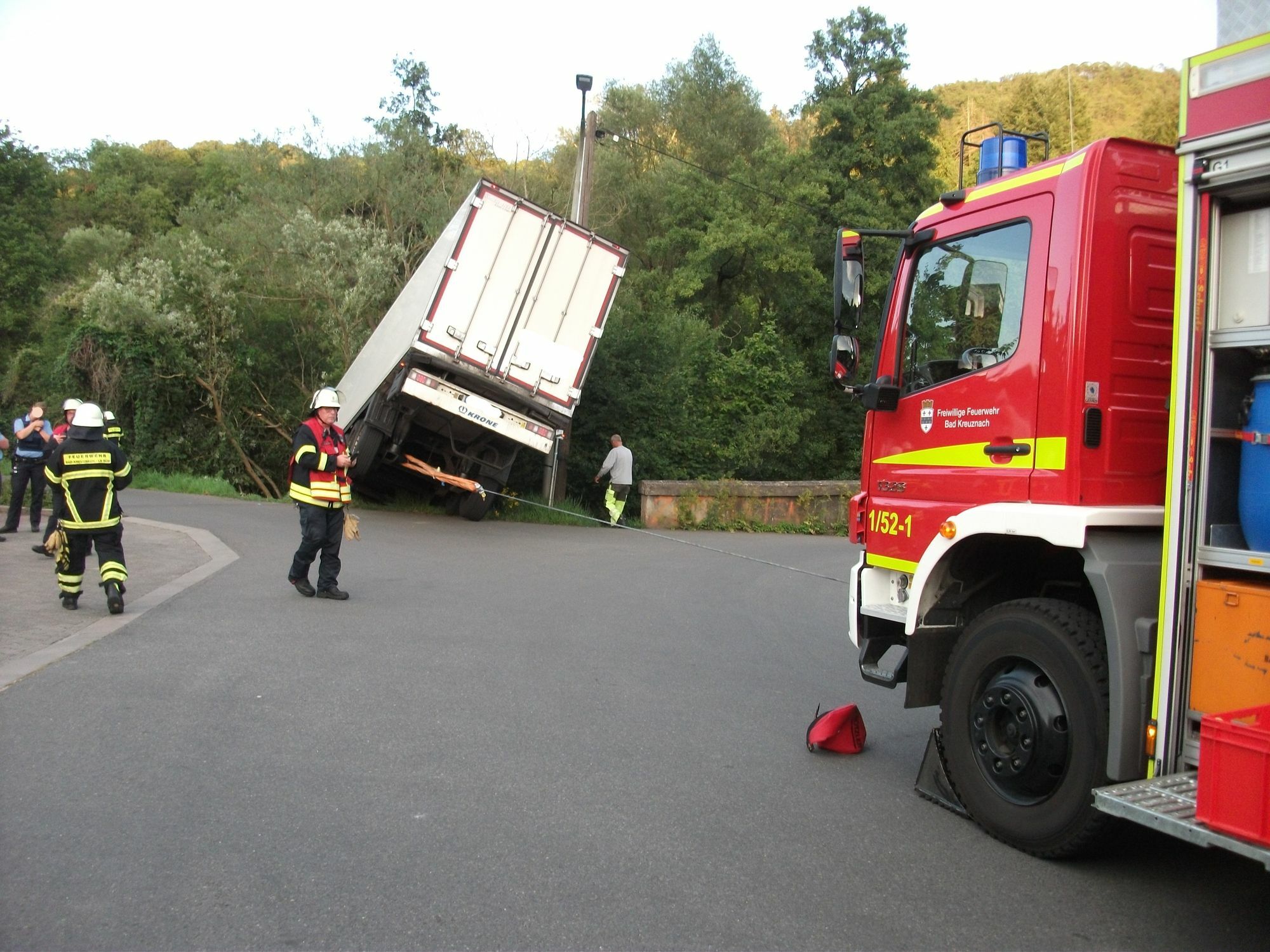 Die angerückten Kräfte der Löschbezirke West und Süd sicherten zunächst mit der Seilwinde des Rüstwagens den Auflieger. Eine Bergungsfirma kümmerte sich mit mehreren Fahrzeugen und etwa zehn Kräften darum, den Sattelzug wieder auf die Straße zu bekommen. Hierfür wurden der Auflieger mit einem Gurtsystem an einem Kran und verschiedene Stahlseile an mehreren Zugfahrzeugen befestigt. Bevor die Bergung starten konnte, wurden mit einer Motorkettensäge über einen Personenbeförderungskorb am Kran und in der Böschung Äste weggeschnitten. Dann wurde der LKW mit Anhänger gehoben und gezogen bis er endlich wieder auf der Straße stand. Während der Bergungsarbeiten war die Zufahrt zu dem Gelände am Bahnübergang gesperrt. Der völlig aufgelöste Fahrer, wurde von seinem Chef nach Hause gefahren. Der Einsatz für die über 30 Wehrleute mit sieben Fahrzeugen war nach rund drei Stunden beendet.
