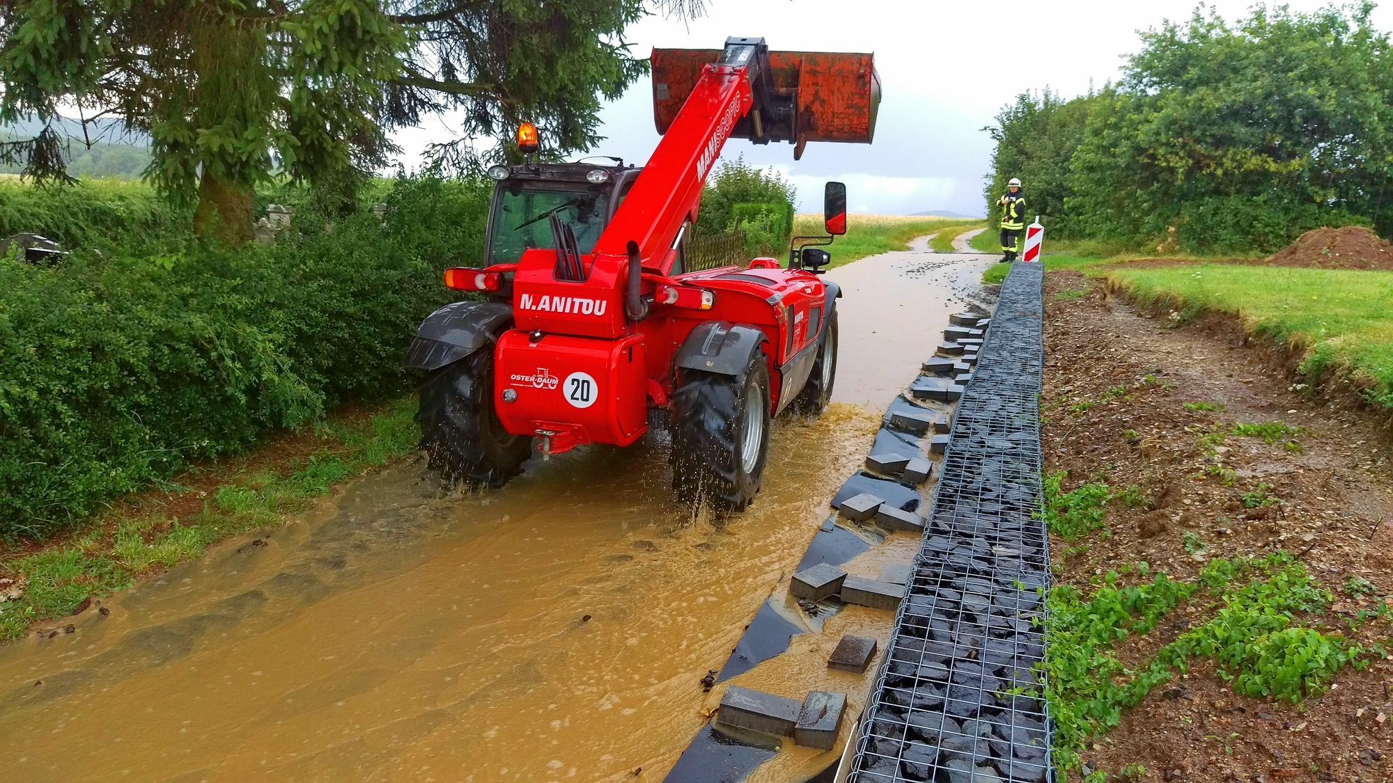 Nach den Wochen der Trockenheit war dies bereits das dritte Gewitter innerhalb einer Woche, bei dem die Kreisstraße 5 zwischen den Ortschaften überflutet wurde, und dies obwohl die Straßengräben im Frühjahr vom Landesbetrieb Mobilität bereits ausgebaggert wurden. Gegen 17.40 Uhr alarmierten Anwohner der Hennweilerer Straße „Im Ambrach“ die Feuerwehr. Über die Felder hinten ihren Häusern kam der braune Sturzbach, er lief durch Gärten und bahnte sich seinen Weg in den Ort. Beschädigungen an Wohnhäuser konnte die Hennweilerer Feuerwehr, unterstützt von einem schnell zur Verfügung gestellten Bagger, durch schnelles Eingreifen verhindern. Es wurde mit Schaufeln und dem Bagger zwei kleinere Dämme errichtet, nach rund 30 Minuten war der Himmel bereits wieder fast wolkenlos.