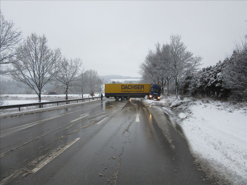 In einem Gefällstück der B 327 kurz vor Morbach verlor der Fahrer gegen 8 Uhr aufgrund unangepasster Geschwindigkeit auf der schneebedeckten Fahrbahn die Kontrolle über sein Fahrzeug. Der Zugmaschine geriet in den angrenzenden Straßengraben und der Auflieger stellte sich quer über die drei Fahrbahnen der B 327. Zur Bergung des Sattelzuges musste ein Spezialfahrzeug aus Trier angefordert werden. Durch den Unfall entstand ein Sachschaden von rund 10 000 Euro. Im Einsatz waren Kräfte der Straßenmeisterei Bernkastel-Kues und der PI Morbach.