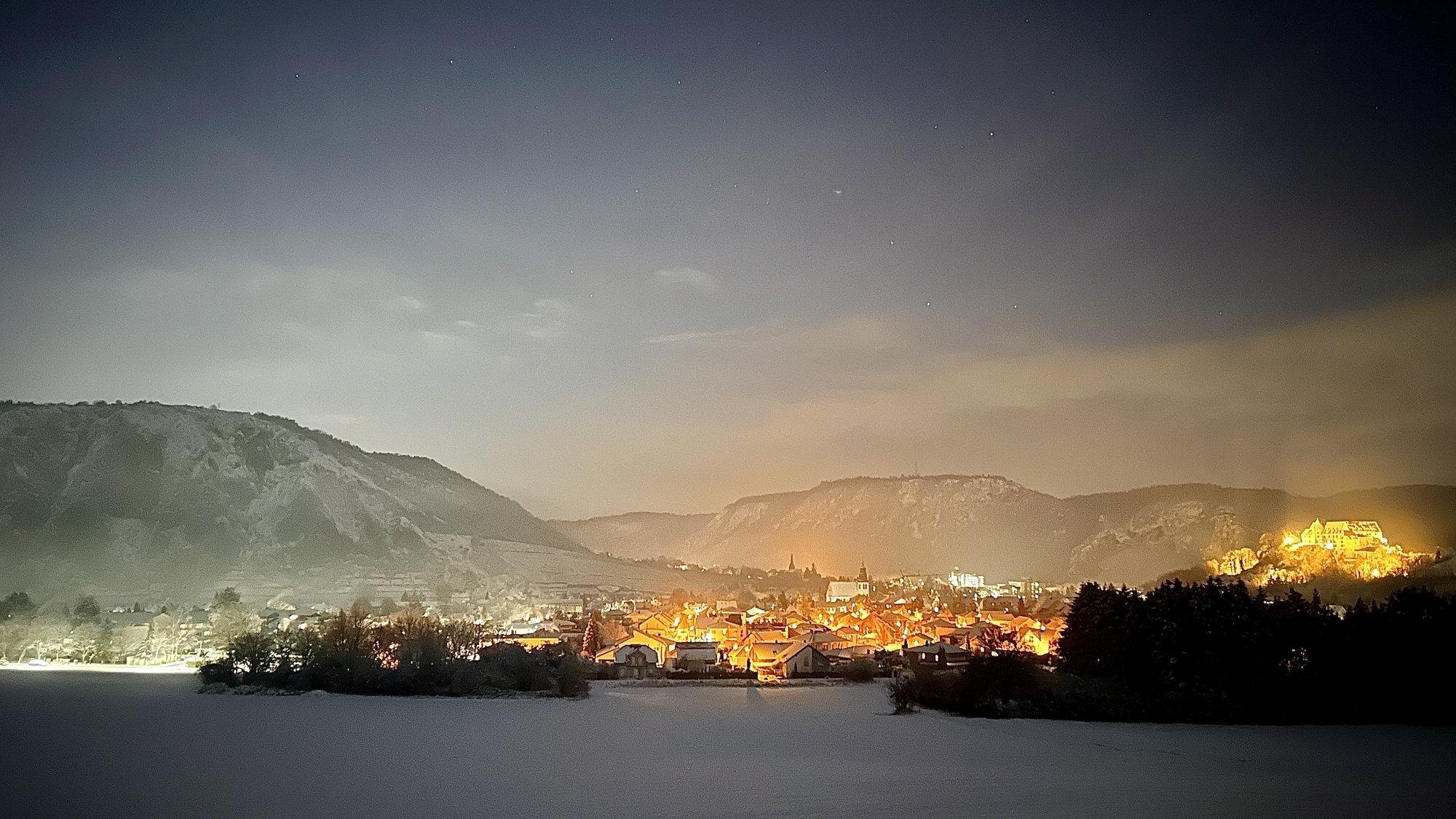 Hier ein Bild aufgenommen letzte Woche abends. Zu sehen im Fordergrund Ebernburg im Hintergrund: Die Gans, Rotenfels und Reihngrafenstein sowie Bad Münster