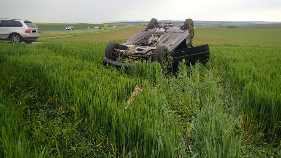 Dadurch verlor der Überholer die Kontrolle über sein Fahrzeug, geriet ins Schleudern und kam nach rechts von der Fahrbahn ab. Dort überschlus sich sein Auto mehrfach, bevor es in einem Rapsfeld zum Liegen kam.