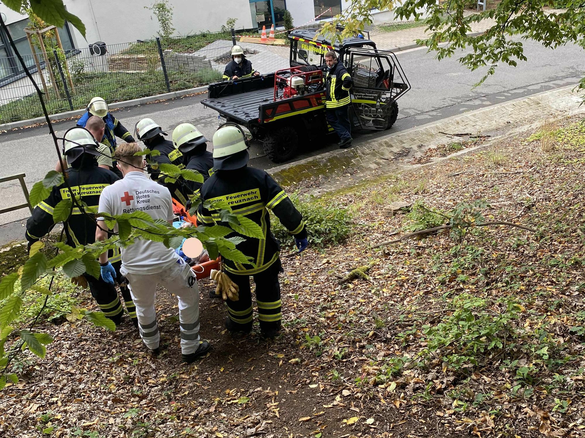 Die angerückten Kräfte des Löschbezirks Süd unterstützten den Rettungsdienst, in dem Sie die zum Abtransport in einem Tragetuch liegende Frau vorsichtig in eine formstabile Schleifkorbtrage hoben und sie dann aus dem unwegsamen Gelände zur Straße trugen. Dort wurde sie auf der Ladefläche des neuen UTV (Utility Vehicle = geländegängiges Nutzfahrzeug) vorsichtig zum Rettungswagen verbracht und sicher auf die Rettungswagentrage umgebettet. Sie kam zur weiteren Versorgung in ein Krankenhaus. Der Einsatz war nach knapp einer Stunde beendet.