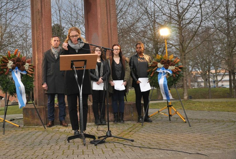 „Schweigen und Gleichgültigkeit sind die allergrößten Vergehen.“ In ihrer Rede zitierte Oberbürgermeisterin Dr. Heike Kaster-Meurer den Friedensnobelpreisträger Ellie Wiesel, ein Überlebender des Holocaust, dem nationalsozialistischen Völkermord, dem sechs Millionen Juden im Zweiten Weltkrieg zum Opfer fielen. „Wer hier schweigt, kann - auch ohne es zu wollen – am Verschweigen mitwirken. Das, was uns sprachlos macht, zwingt uns gerade deshalb zu reden.“, so die OB. 71 Jahre nach dem Zweiten Weltkrieg „können wir als Europäer mit Stolz auf den zurückgelegten Weg der Demokratie schauen. Heute stehen wir vor der Herausforderung, unsere Werte zu verteidigen“, so die OB. Dazu zählt insbesondere der Schutz von Minderheiten, sagte sie vor dem Hintergrund des erstarkenden Rechtsradikalismus in Deutschland und beklagte dabei die zunehmenden anti-jüdischen Übergriffe, von Synagogenbränden bis zu Schikanen jüdischer Kinder an staatlichen Schulen. An die Schüler gewandt appellierte sie: „Ich wünsche mir, dass Ihr mit Euren Lehrern erfahrt und begreift, was Auschwitz bedeutet, und dass Ihr über das, was Auschwitz uns lehrt, nachdenkt. Morgen werdet Ihr die Bürger sein, die Verantwortung dafür tragen, dass alles, was erneut zu einer solchen Verkettung von Hass und Gewalt führen könnte, verhindert wird.“ Kim Weinel, Tatjana Fuchß und Keisha Reday sind Schülerinnen der IGS Sophie-Sondhelm, deren Namensgeberin im KZ Auschwitz ermordet wurde. Sie lasen einen Text von Zarah Weiss vor, die als Kind in das Förderprogramm der Eckenroth-Stiftung aufgenommen wurde und zurzeit in Wien ihr Masterstudium in Philosophie, Literatur und Kultur absolviert. In bewegenden Worten schildert die Autorin ihre Eindrücke vom Besuch des Jüdischen Museums in Berlin, insbesondere von der Installation des Architekten Daniel Liebeskind, leere Räume (Voids), die für die Verdrängung und Verfolgung der Juden in der deutschen Gesellschaft stehen. Im größten Void steht die Installation „Gefallenes Laub“ des israelischen Künstlers Menashe Kadishman. Über 10.000 Gesichter aus Eisen bedecken den Boden. „.. tote Menschen, die alle einmal gefühlt und gedacht haben – auf einen Haufen geworfen. Zum Vergessen, irgendwann verbrannt. Diese Gesichter hier werden nie verbrennen. Sie werden immer erinnern“, schreibt Zarah Weiss.