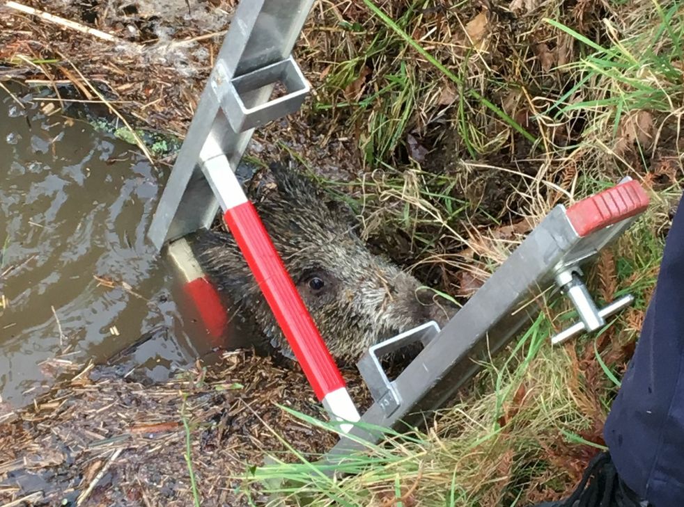 Ein Feuerwehrmann, welcher sich bereits auf der Anfahrt mit einem Überlebensanzug ausgerüstet hatte, stieg gesichert an einer Feuerwehrleine in gebührendem Abstand zu dem Tier ins Wasser. Das Wildschwein war zwischenzeitlich unter der Palette ausgebüchst, kam aber aus eigener Kraft nicht aus dem Wasser und trieb weiter ab. Zwei Steckleiterteile wurden verwendet, um das Tier zu lenken. Kurz vor der Fußgängerbrücke Nähe des Pumpenhäuschens an der Salinenbrücke, konnte das Wildschwein mit beiden Leiterteilen fixiert werden. Der Kamerad im Schutzanzug, konnte das Tier mit einem beherzten Griff an dessen Hinterläufe aus dem Wasser heben. Vorsorglich wurde auch der Rettungsdienst an die Einsatzstelle bestellt, falls sich das aufgeregte Tier mit Bissen gegen die Rettung gewehrt hätte. Wieder an Land, lief das Wildschwein selbstständig zurück in den Wald. Fotos: Freiwillige Feuerwehr Bad Kreuznach
