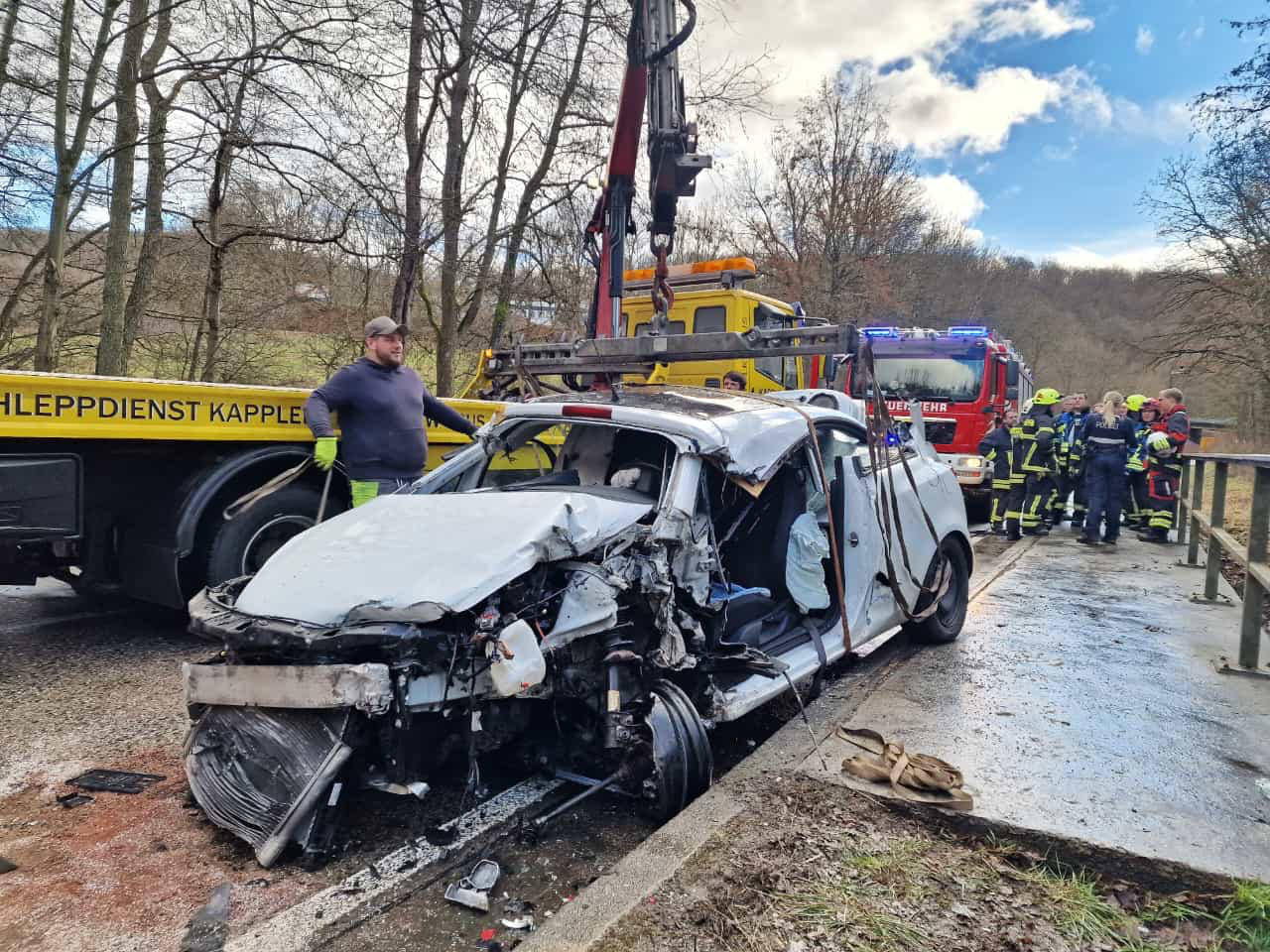 Ein 27-jähriger Autofahrer war mit seinem Opel Corsa gegen 14 Uhr auf der B41 in Fahrtrichtung Idar-Oberstein unterwegs, als er im Hellbergtunnel bei Kirn aus bislang ungeklärter Ursache den Bordstein touchierte und daraufhin die Kontrolle über sein Fahrzeug verlor. Der Corsa geriet auf die Gegenfahrbahn und rammte einen entgegenkommenden Tieflader, der mit einem Bagger beladen war. Der Kleinwagen wurde durch die Wucht des Aufpralls so stark beschädigt, dass der 27-Jährige mit schwerem hydraulischem Gerät aus dem Wrack befreit werden musste. Der junge Mann kam ohne schwere Verletzungen davon, wurde aber zur weiteren Untersuchung ins Krankenhaus gebracht. Die Bergung des ebenfalls stark beschädigten Tiefladers im Tunnel gestaltete sich schwierig: Die B41 war für mehrere Stunden aufgrund der Rettungs- und anschließenden Säuberungs-Arbeiten gesperrt. Das sorgte im abendlichen Berufsverkehr für kilometerlange Staus auf der temporär eingerichteten Umleitung durch die Ortslage von Kirn.