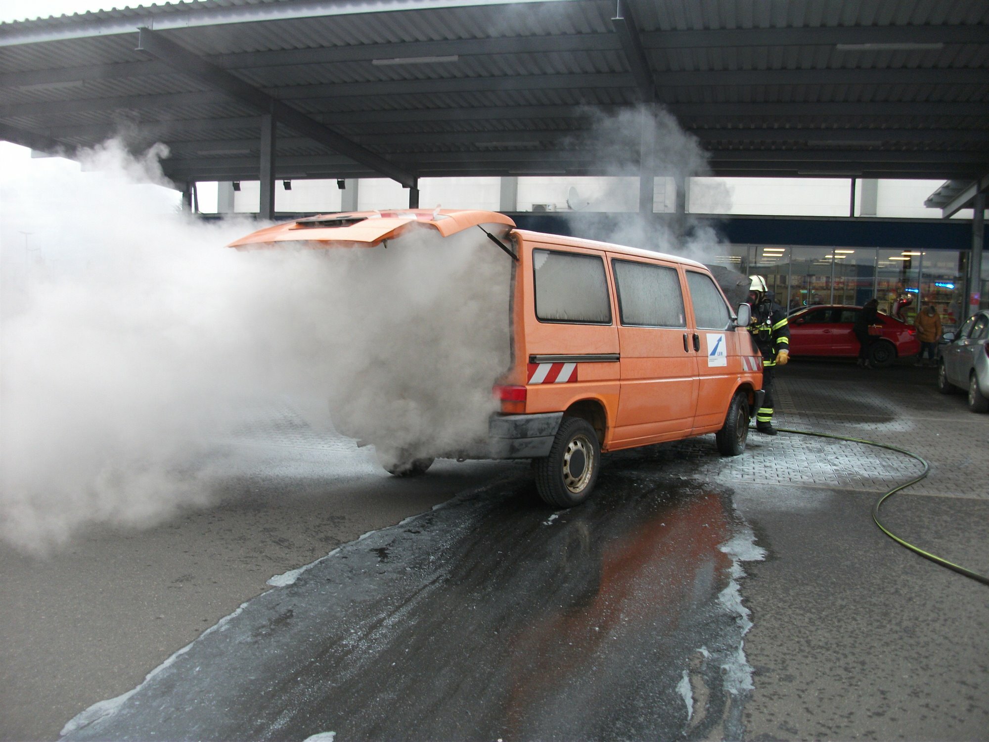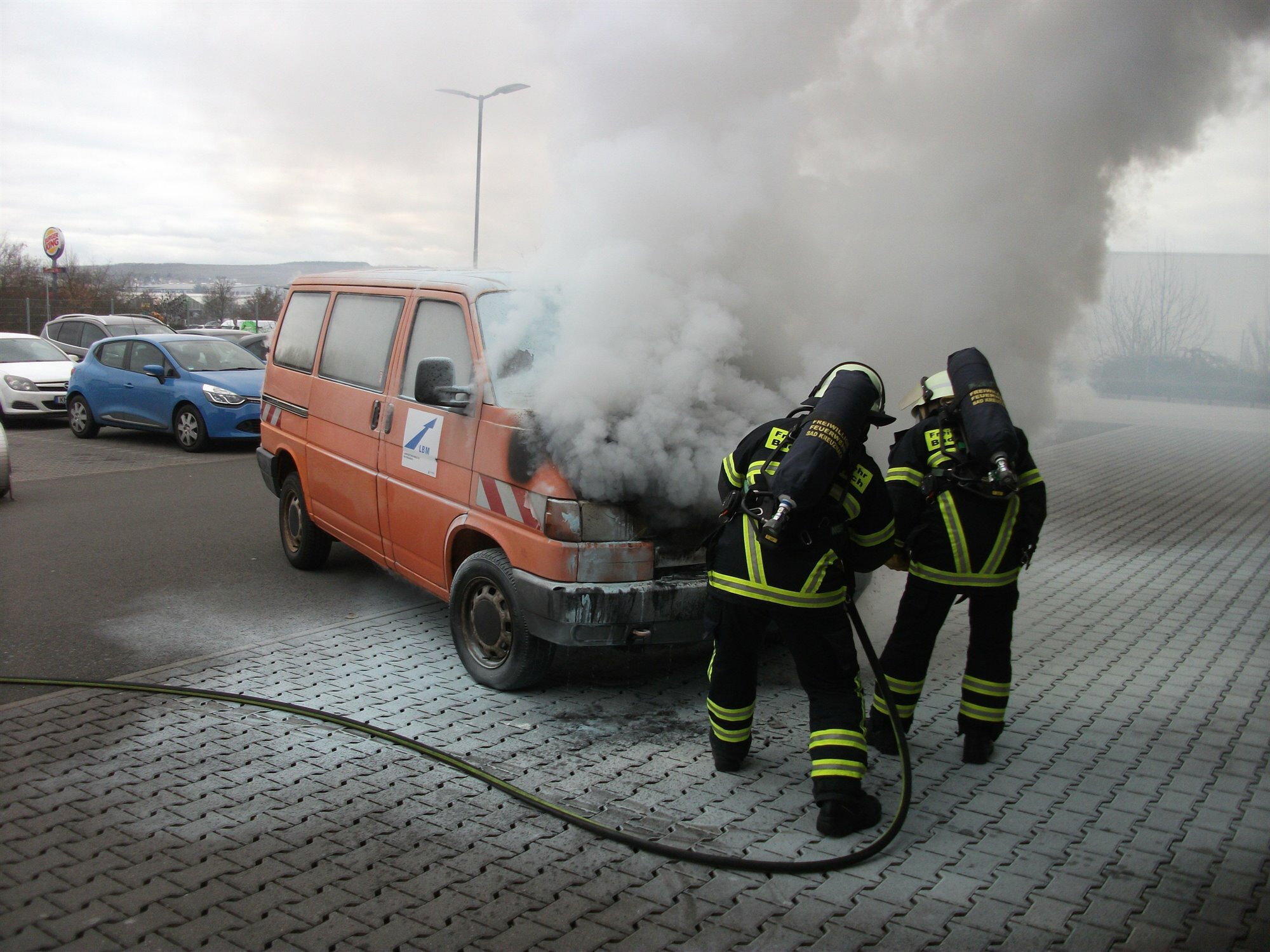 Bad Kreuznach. Der Fahrer stand gerade an der Kasse des Marktes, als er von einem hereinkommenden Kunden auf die Rauchentwicklung an seinem Firmenfahrzeug aufmerksam gemacht wurde. Daraufhin schob der Fahrer den Transporter auf die Freiffäche des Parkplatzes und versuchte, den Brand mit einem Pulverlöscher zu löschen. Als die Feuerwehr eintraf, schlugen jedoch bereits Flammen aus der Motorhaube des Fahrzeugs. Die angerückten Kräfte der Löschbezirke Ost und Süd löschten den Brand mit einem Trupp unter Atemschutz und einem C-Rohr. An dem Transporter entstand Totalschaden.