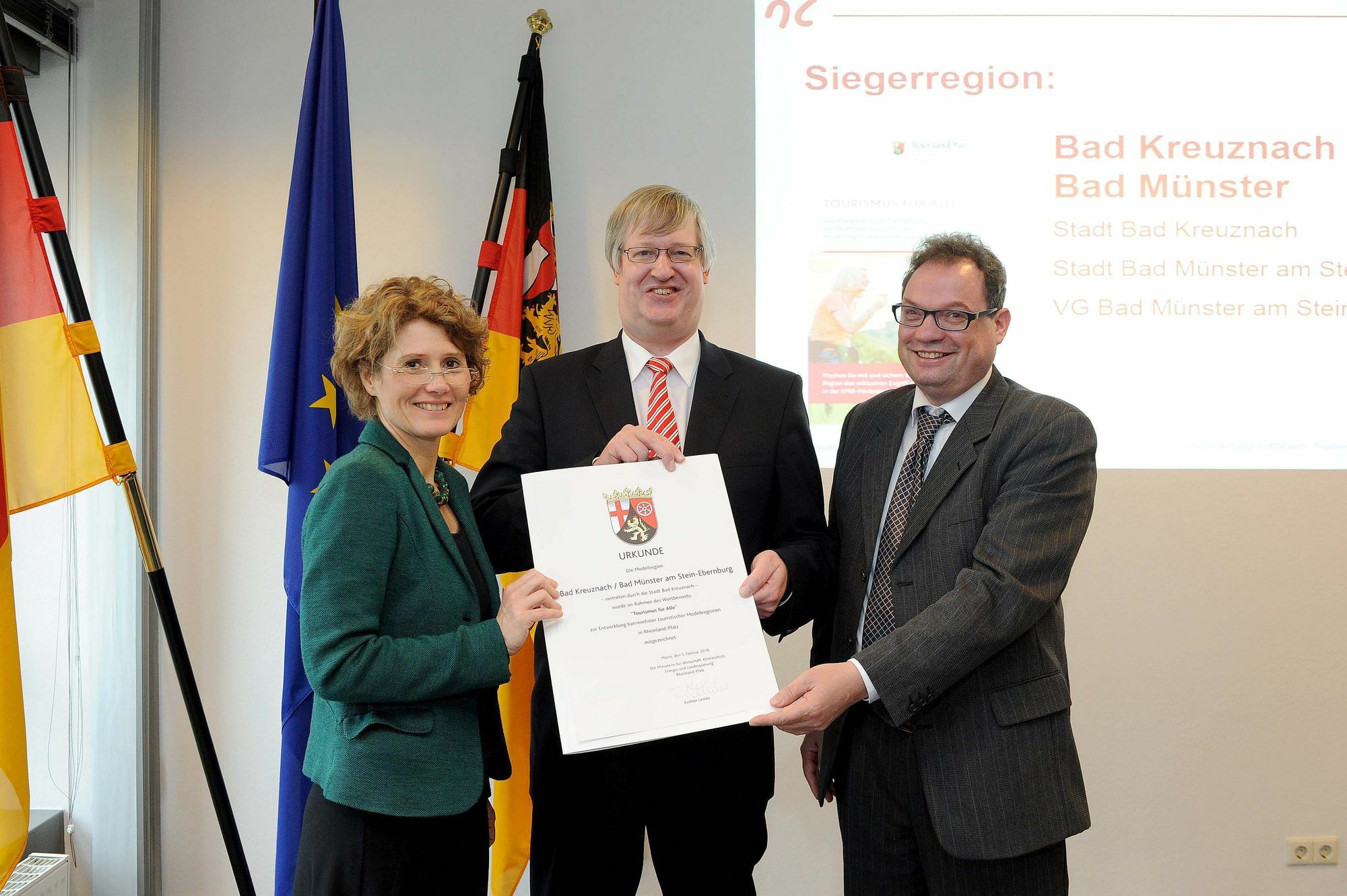 Bürgermeister Wolfgang Heinrich und Dr. Michael Vesper, Geschäftsführer der Gesundheit und Tourismus für Bad Kreuznach GmbH, durften jüngst von Staatsministerin Eveline Lemke die Urkunde zur erfolgreichen Teilnahme am Wettbewerb entgegen nehmen (Foto). Das von der GuT federführend im Auftrag der Stadt erarbeitete Konzept hatte sich in der zweiten Runde erfolgreich unter 14 Bewerbern durchgesetzt und gehörte zu den fünf Beiträgen, die die unabhängige Jury aus Tourismusfachleuten besonders überzeugten.