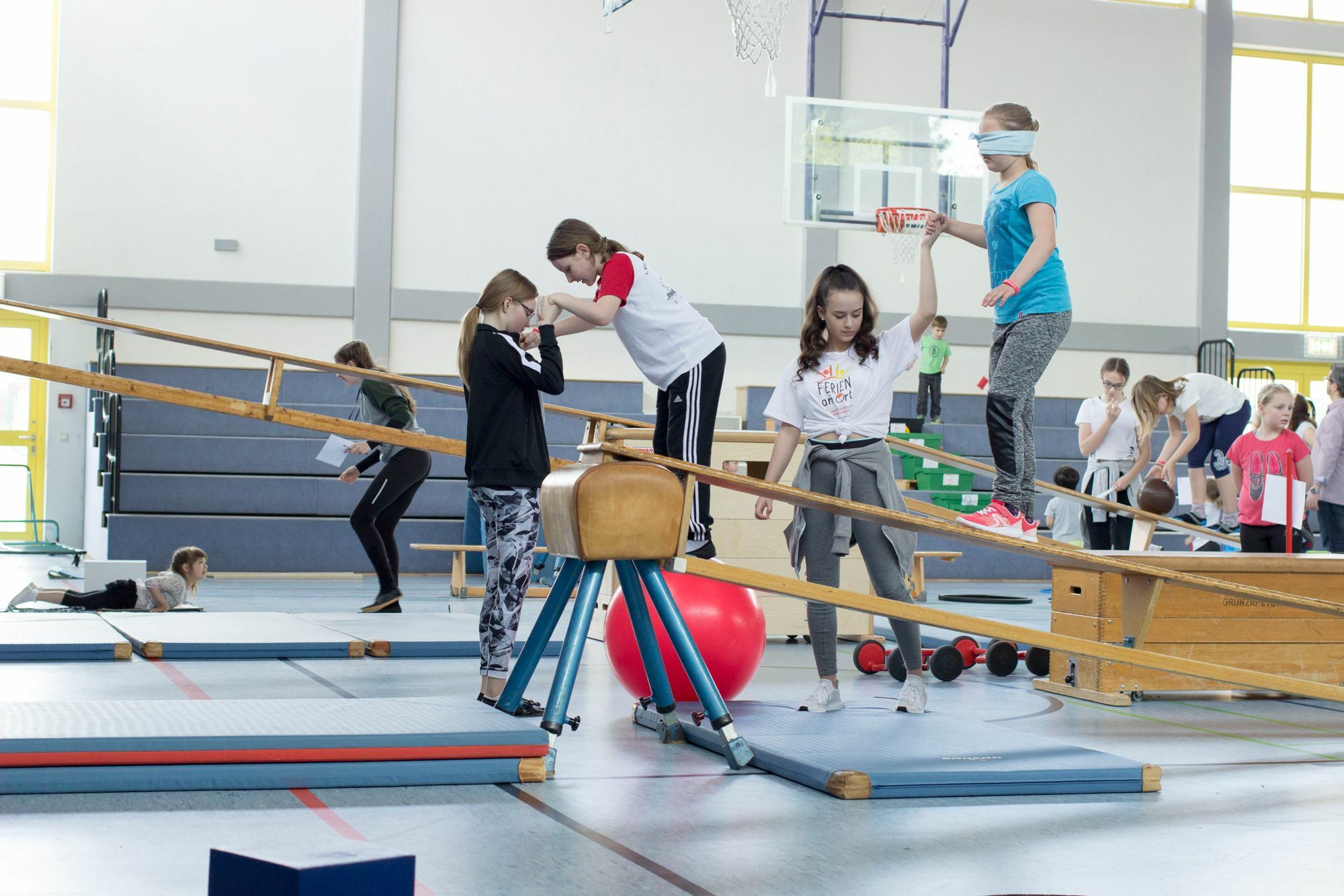 Bei der Anmeldung gab's schmucke Armbändchen, danach ging's zur Aufwärmrunde. Neun verschiedene Übungen galt es zu absolvieren und nach zweiminütigem Warmspringen auf der Hüpfburg ging es in der großen Halle der Martin-Luther-King-Schule an die Geräte. Reck, Trampolin, Barren, Klettergerüst, Bock, Turnbänke und Schwebebalken, jedoch in außergewöhnlichen Aufbauvarianten, boten viel Abwechslung. Da kletterte man fast bis ganz hoch zur Hallendecke, ein Parcours wurde mit einer, auf der Hand balancierenden Pfauenfeder bewältigt oder ein Klicker rollte geschickt durch und über Turngeräte. Je nach Geschicklichkeit, Kraft, Mut, Gleichgewicht und Sportlichkeit konnten fünf oder zehn Punkte eingeheimst werden. Leckere Kuchen und erfrischende Getränke versüßten die Verschnaufpausen. Abschließend gingen alle Teilnehmer nach zwei sehenswerten Tanzaufführungen der Beatbienchen und der Lollipops mit einer Überraschungstasche und einer Urkunde zufrieden nach Hause. Die Urkunde schmückte bei allen eine hohe Punktzahl und ein tolles Foto. Emilia Berendeev und Alina Stepa, zwei sehr sportliche Mädels des KTC, erreichten die Höchstpunktzahl von 205 bei 210 möglichen Punkten. Außerdem hatten die Besucher die Gelegenheit, für einen guten Zweck am Glücksrad zu drehen und tolle Preise einzuheimsen. Der Erlös, insgesamt 102 Euro, ist für die krebskranke Lea aus Bretzenheim bestimmt (der WochenSpiegel berichtete).