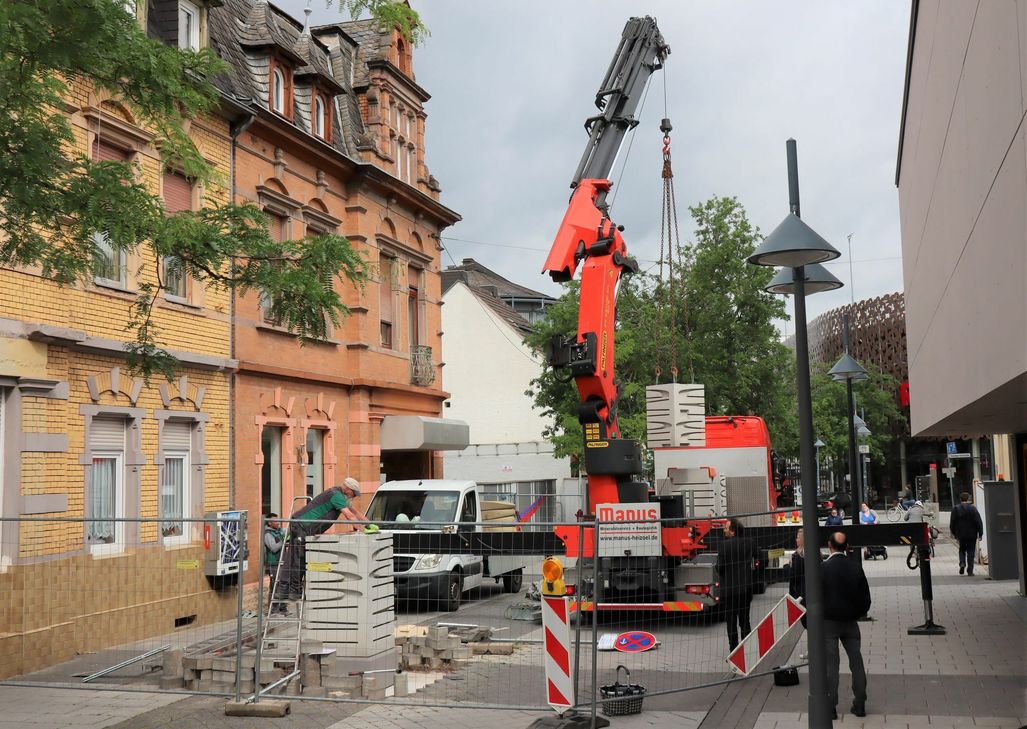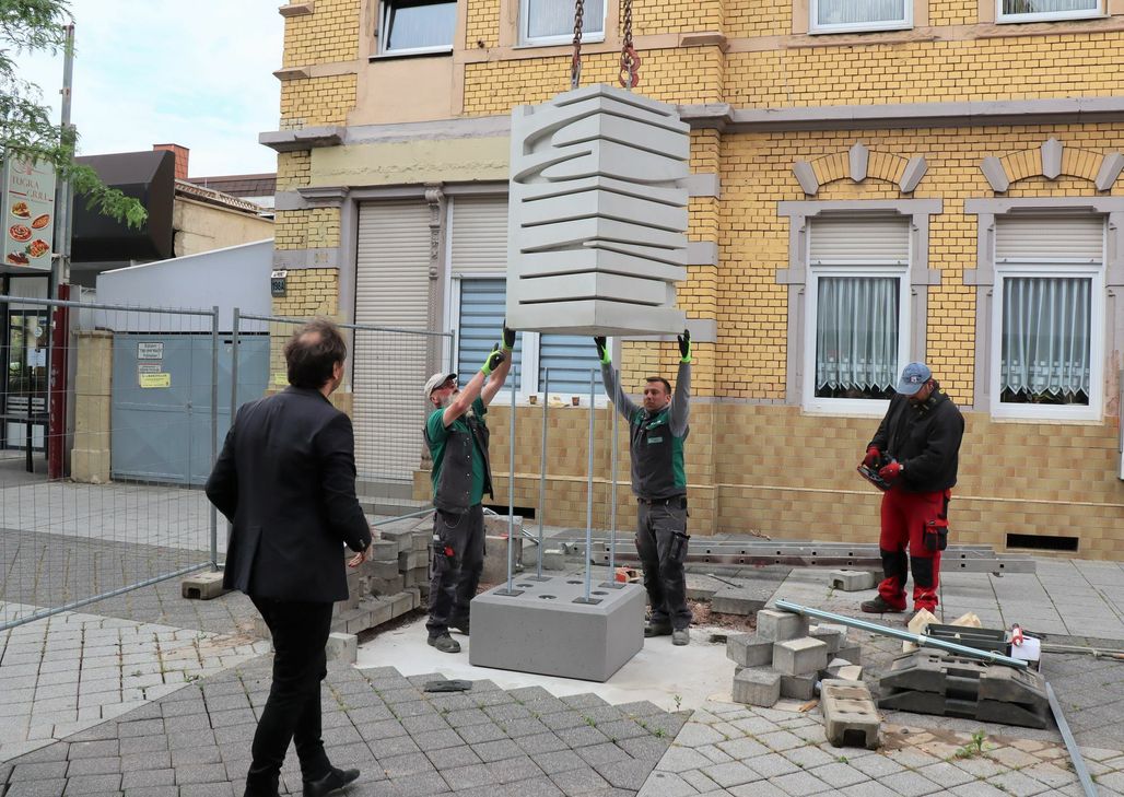 Am Freitagvormittag wuchs vor dem Haus der Stadtgeschichte am Löwensteg Block für Block ein modernes Kunstwerk in die Höhe: Die Betonskulptur stammt von dem Frankfurter Künstler Levent Kunt, der im Beisein vieler Schaulustiger den Aufbau begleitete.