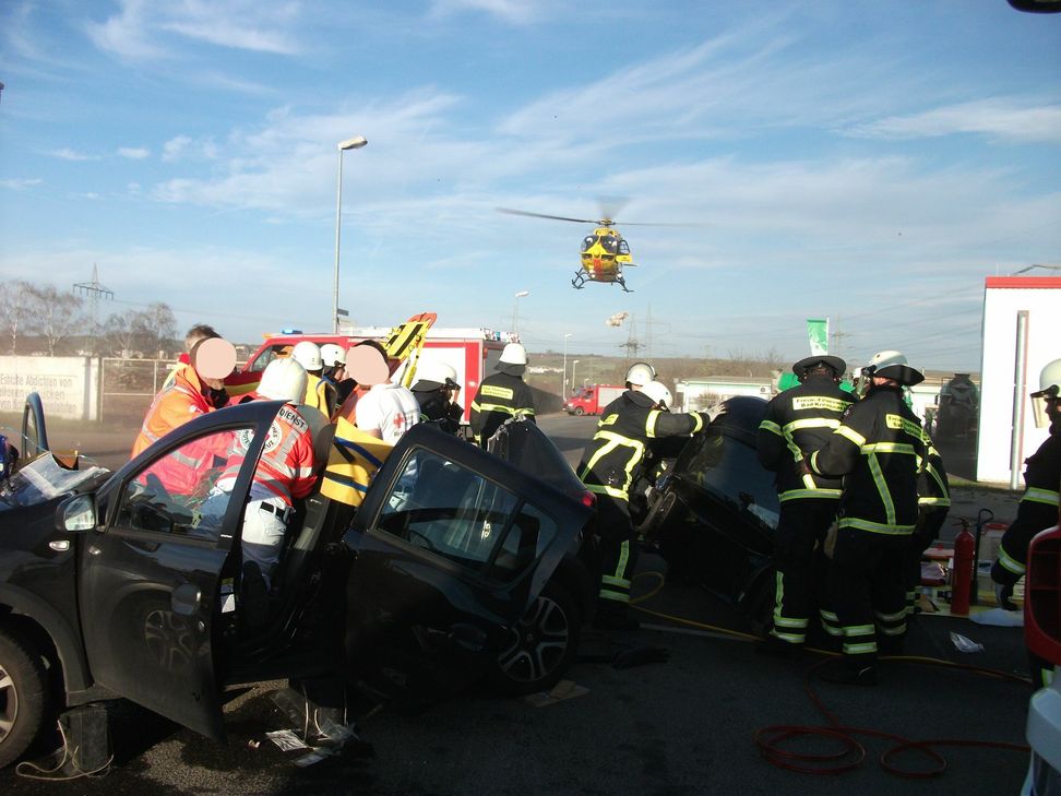 Die angerückten Kräfte der Löschbezirke Ost und Süd entfernten mit hydraulischem Rettungsgerät das Fahrzeugdach und die Türen auf der Beifahrerseite, um den Patient auf einem Spineboard schonend aus dem Fahrzeug zu holen. Er wurde, ebenso wie die Fahrerin des Fahrzeugs, ins Krankenhaus gebracht.