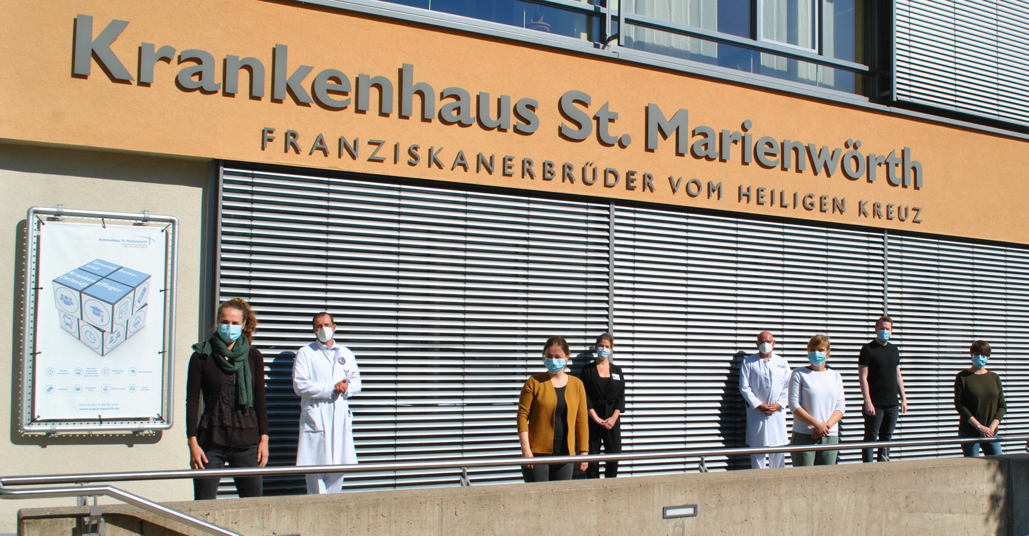 Elisa Carina Ingelfinger, Christina Lapp, Leonie von Cube, Fabian Pohlmann und Tabea Wieler wurden bei strahlendem Sonnenschein von ihm, Recruiterin Franziska Becker und „PJ-Mentor Chirurgie“ Johannes Nikolay herzlich empfangen. Das sogenannte Praktische Jahr ist ein fester Bestandteil des Medizinstudiums, den die Studierenden nach dem 2. Staatsexamen absolvieren. St. Marienwörth ist seit Mitte 2015 Lehrkrankenhaus der Johannes Gutenberg-Universität Mainz und durfte jetzt symbolisch im Kreis der fünf den 100. „PJler“ begrüßen. Innerhalb des Praktischen Jahres gehören die Innere Medizin und die Chirurgie zu den Pflichtfächern für die angehenden Ärzte. Darüber hinaus bietet St. Marienwörth noch die Anästhesiologie und die Psychosomatik als Wahlfächer an. Insgesamt ist das praktische Jahr in drei Teile gegliedert, einzelne „Tertiale“ können auch in anderen Kliniken absolviert werden. Professor Volker Schmitz ist sehr erfreut beim Blick auf die Statistik: „Von den nun insgesamt 100 „PJlern“ konnten wir zwanzig für eine weitere Zusammenarbeit gewinnen. Drei sind als Assistenzärzte in die Chirurgie und siebzehn in die Innere Medizin übernommen worden. Gerade in der jetzigen Coronazeit wird es sehr deutlich, wie wichtig das Krankenhauspersonal und deren qualifizierte Ausbildung ist, die hier im Haus einen sehr hohen Stellenwert hat.“ Dem nationalen Trend folgend ist auch die Anzahl der Medizinstudentinnen im Praktischen Jahr überproportional mit 73, entsprechend sind es 27 Medizinstudenten, die allesamt praktische Erfahrungen im St. Marienwörth sammelten.