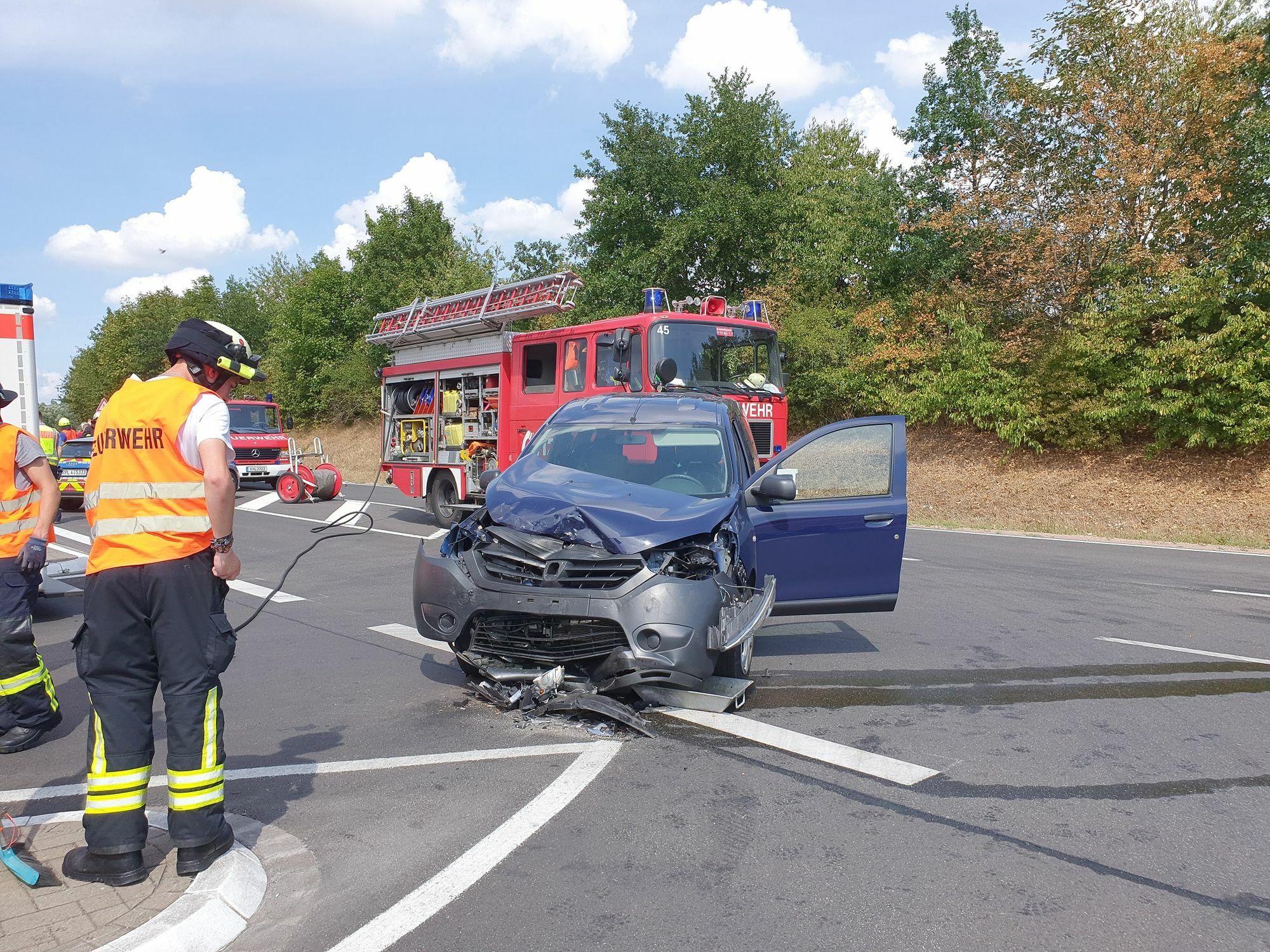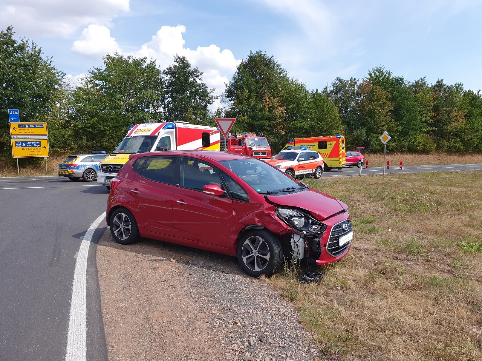 Beim Linksabbiegen übersah der 59-jährige Fahrer eines Hyundai den Dacia einer 80-jährigen Frau. Die Fahrzeuge stießen frontal zusammen. Beide Fahrer und der 82-jährige Beifahrer der Dacia-Fahrerin wurden bei dem Unfall leicht verletzt. Alle Fahrzeuginsassen konnten die beiden Unfallfahrzeuge selbstständig verlassen und wurden durch die Besatzungen der Rettungsfahrzeuge versorgt. Die Feuerwehren Rüdesheim und Hargesheim-Roxheim unterstützten die Polizei bei der Absicherung der Unfallstelle. Der Brandschutz wurde sichergestellt, die Fahrzeugbatterien abgeklemmt und auslaufende Betriebsmittel aufgefangen. Nachdem der Rettungsdienst die Unfallstelle verlassen hatte, konnten auch die Feuerwehren, die mit 44 Einsatzkräften ausgerückt waren, den Einsatz beenden. Die beiden am Unfall beteiligten Fahrzeuge waren nicht mehr fahrbereit und mussten abgeschleppt werden.