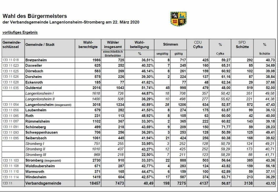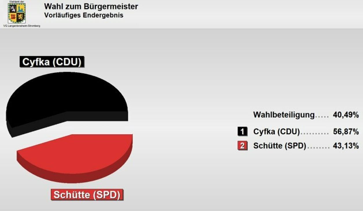 Nach dem vorläufigen amtlichen Endergebnis stimmten 4137 der wahlberechtigten Bürgerinnen und Bürger für den CDU-Kandidaten Michael Cyfka. Matthias Schütte erhielt 3138 Stimmen und damit 43,13 Prozent der Stimmen. Insgesamt waren 18457 Bürgerinnen und Bürger zur Wahl aufgerufen, von denen 7473 eine Stimme abgaben. 7275 Stimmen waren gültig. Die Wahlbeteiligung lag bei nur 40,49 Prozent. Michael Cyfka war seit 2014 Bürgermeister der VG Langenlonsheim. Weil die Amtszeit nach der Fusion mit der VG Stromberg zum 31. Dezember 2019 endete, führte er die Amtsgeschäfte der neuen Verbandsgemeinde als Beauftragter weiter. "Unter Cyfka ist es in den vergangenen Monaten gut gelungen, in der fusionierten Verbandsgemeinde eine neue Identität zu schaffen. Ich bin mir sicher, dass er es schaffen wird, die Bevölkerung auf dem weiteren Weg mitzunehmen", gratulierte die CDU-Landesvorsitzende Julia Klöckner dem dreifache Familienvater Cyfka zum Sieg.