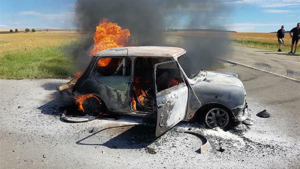 Am Samstagnachmittag, 8. Juli, war der 55-jährige Fahrzeugführer aus Simmern mit seinem mittlerweile 26 Jahre alten Mini auf der K 58 unterwegs, als er plötzlich Benzingeruch im Innenraum des Fahrzeugs feststellte. Er stellte seinen PKW auf einem geteerten Feldweg ab und stieg aus seinem Schmuckstück aus. Der Mini stand innerhalb weniger Augenblicke im Vollbrand und brannte letztlich vollständig aus. Der Fahrzeugführer blieb unverletzt. Der Sachschaden beträgt etwa 8 000EUR. Die Feuerwehr löschte das Fahrzeugwrack ab und konnte das Übergreifen der Flammen auf die angrenzenden Felder verhindern. Gegen 18.35 Uhr war die Feuerwehr erneut gefordert. Sie wurde, ebenso wie die Polizei, zu einem Garagenbrand nach Tiefenbach gerufen. Beim Eintreffen der Einsatzkräfte hatte der Brand bereits von der Garage auf das Wohnhaus übergegriffen. Durch den schnellen Einsatz der Feuerwehr konnte der Brand schnell gelöscht und ein Vollbrand des Wohnhauses verhindert werden. Die Brandursache ist derzeit noch unklar. Ermittlungen zur Brandursache wurden aufgenommen. Die Schadenshöhe wird auf 80 000 EUR geschätzt. Verletzt wurde durch den Brand glücklicherweise niemand.