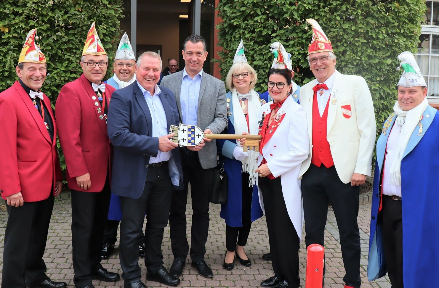 Der Schlüssel zum Rathaus ist wieder in Händen des Stadtvorstands.Der Verein Kreiznacher Narrefahrt hatte die geplante Rückgabe nach der ausgefallenen Kampagne absagen müssen. Um wieder selbst regieren zu können, hat Oberbürgermeister Emanuel Letz jetzt den Schlüssel mit der Stadtkasse angemahnt. Er freute sich zusammen mit Bürgermeister Thomas Blechschmidt, dass die „gewohnte Ordnung“ wiederhergestellt ist. Die Schlüsselrückgabe wurde gestaltet von den Jubilaren der Kampagne 2021/22, der Großen Karneval Gesellschaft Kreuznach und der Weißen Fräck, sowie einer Abordnung der Kreiznacher Narrefahrt unter ihrem 1. Vorsitzenden Manfred Schulze. Zur Vorfreude und Einstimmung auf die neue Fastnachtssaison überreichte die GKGK dem Oberbürgermeister und dem Bürgermeister den Orden der vergangenen Kampagne.