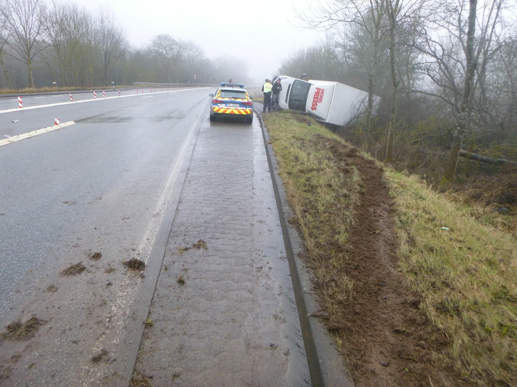 Im Bereich der Abfahrt Weiler bei Monzingen geriet der Fahrer mit dem Vorderreifen nach links auf die Fahrbahnabtrennung. Beim Gegenlenken übersteuerte er den Transporter, verlor die Kontrolle und geriet ins Schleudern. Das Fahrzeug geriet nach rechts von der Fahrbahn ab, kippte um und blieb im Abhang auf der Seite liegen.