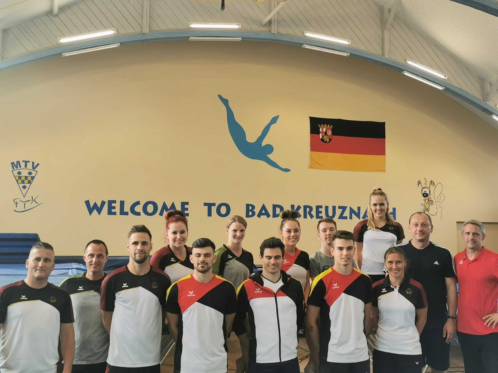 So nahmen gegen Ende der Sommerferien die Kinder des Landeskaders von Rheinland-Pfalz an einem Lehrgang teil, machten Freizeitausflüge oder bereiteten sich schon mit diversen Trainings auf die kommenden Wettkämpfe vor. Der erste Wettkampf, die offenen Rheinhessischen Meisterschaften, stand bereits am 25. August in Mainz-Hechtsheim an. Am letzten Ferienfreitag wurden in einer öffentlichen Talentsichtung Kinder willkommen geheißen und mit verschiedenen turnerischen Übungen angeleitet. Einige neue Talente führen nun den Flugsport in verschiedenen Gruppen und Kursen weiter. Auch ein Kurs für alle Erwachsene, die das Trampolinturnen erlernen und ausprobieren möchten ist bereits gestartet. Auch internationalen und nationalen Besuch durch die Trainingslager hatten die Trampoliner im Bundesstützpunkt. Eine Woche lang bereiteten sich die Düsseldorfer Nachwuchskaderathleten unter dem ehemals selbst aktiven Turner Alexej Kessler auf den Lehrgang mit Kadertest in Frankfurt vor. Darauf folgte die österreichische Nationalmannschaft zum Trainingslager in Bad Kreuznach. Unter ihnen war auch der Jugendolympia-Dritte Benny Wizani dabei. Aktuell führt Patrick Siegfried als DTB-Team-Manager den Nationalkader-Lehrgang in den Räumen des Bundesstützpunktes Trampolin Bad Kreuznach durch. Vier Frauen und fünf Männer machen sich bereit für die WM-Qualifikation. Silva Müller, Leonie Adam, Aileen Rösler und Isabel Baumann möchten für die deutschen Frauen das Ticket beim internationalen Kiepenkerl-Cup am 7. September lösen. Im Männerbereich bereiten sich im Lehrgang Fabian Vogel, Matthias Pfleiderer, Tim-Oliver Gesswein, Lars Fritsche und Matthias Schuldt auf die Qualifikation vor. Unterstützt und beraten wird das Trainerteam um Steffen Eislöffel, Katarina Prokesova und Michael Kuhn vom ehemaligen Weltklasse-Turner und heutigen Trainer in den USA, Dimitri Poliarusch.