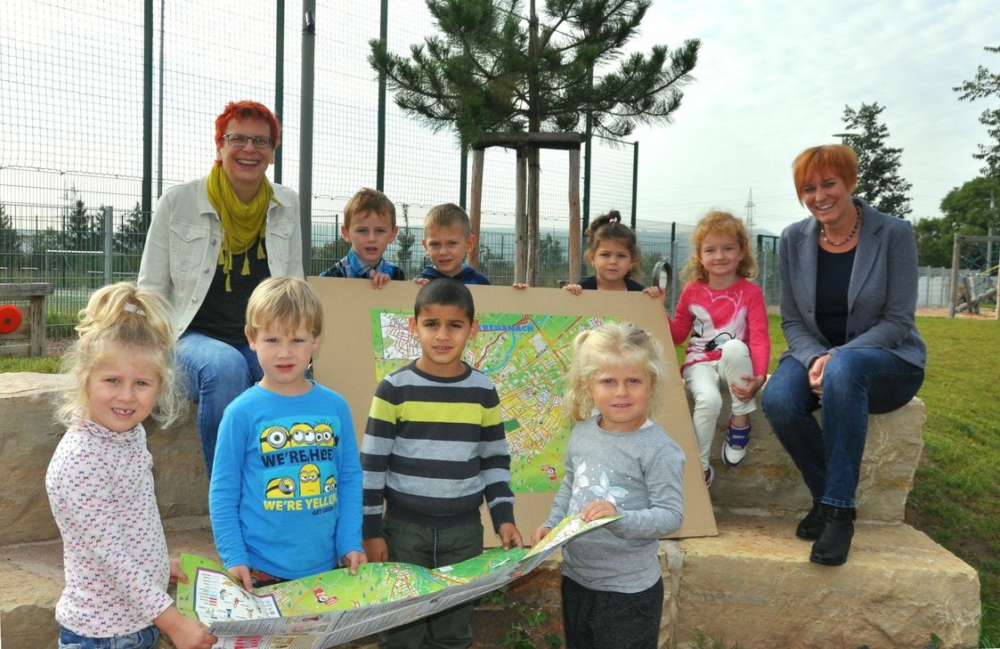 Erstmals seit zehn Jahren hat es auch wieder Rundgänge der Stadtquartiere mit den dort wohnenden Kindern gegeben. Kinder aus den städtischen Grundschulen (jeweils aus vierten Klassen). haben Monika Degen, bei der Stadt für die Jugend- und Sozialplanung zuständig, und Mitarbeiter des Fachbüros Kobragraphics (pädagogische Betreuung, Redaktion und Layout) begleitet. Neu aufgenommen ist der Stadtteil Bad Münster am Stein-Ebernburg, dessen Plan, gespickt mit bunten Grafiken und Symbolen, zeigt, wieviel er Kinder im Alter bis zu zehn Jahren zu bieten hat. An diese Altersgruppe richtet sich der Kinderstadtplan, der daher in allen Grundschulen und Kindertagesstätten verteilt wird und zudem im Jugendzentrum „Mühle“ in der Bücherei und im Amt für Kinder und Jugend ausliegt. An den Kosten von rund 11.000 Euro hat das Land 40 Prozent (rund 4700 Euro) aus dem Aktionsprogramm „Kinderfreundliches Rheinland-Pfalz“ gefördert. „Wir hoffen, dass der neue Kinderstadtplan viele Anregungen bietet, in der Freizeit mit Eltern oder mit Freundinnen und Freunden auf Entdeckungsreise zu gehen und Neues zu erleben.“, wünscht Oberbürgermeisterin Dr. Heike Kaster-Meurer viel Spaß beim Erkunden und Spielen. Foto: Den neuen Kinderstadtplan hat Monika Degen (links) in die Kita „zur Klaster“ nach Winzenheim mitgebracht. Auch die Leiterin des Amtes für Kinder und Jugend, Sabine Raab-Zell, ist mit dem Ergebnis sehr zufrieden.