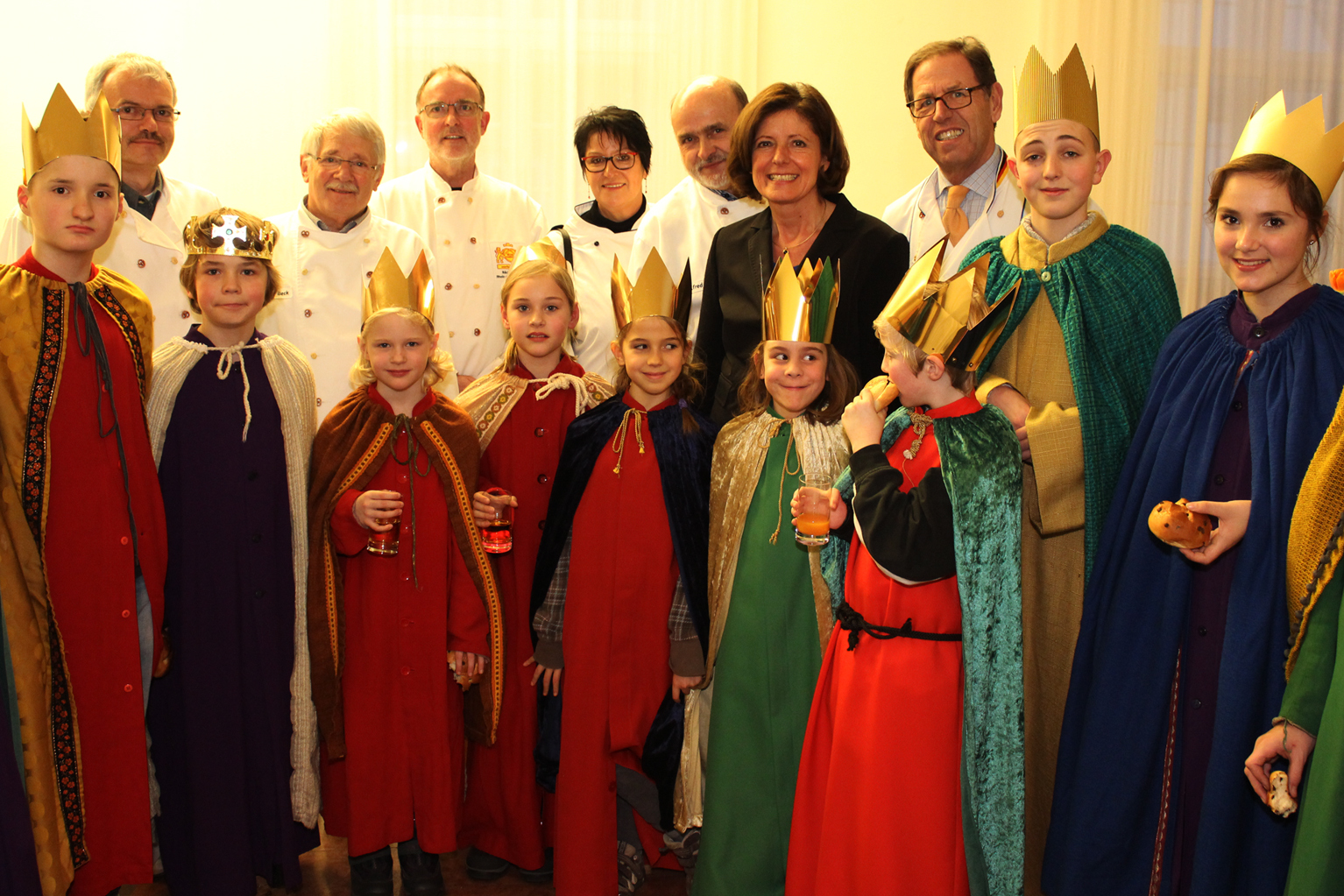 In inzwischen vertrauter Runde schnitt Malu Dreyer das leckere Backwerk mit Nuss-, Mohn- und Marzipan-Füllung an: „Bei uns zuhause wurde auch viel gebacken – vielleicht nicht ganz so schön,“ staunte die Ministerpräsidentin über den Riesenbrezel, der ihr und ihren Gästen von der Bäckerinnung Rhein-Nahe-Hunsrück richtig gut schmeckte. Auch die Sternsinger, die zum anschließenden Empfang der Staatskanzlei eingeladen waren, bekamen ein Stück vom leckeren Neujahrsbrezel der Bäckermeister ab.