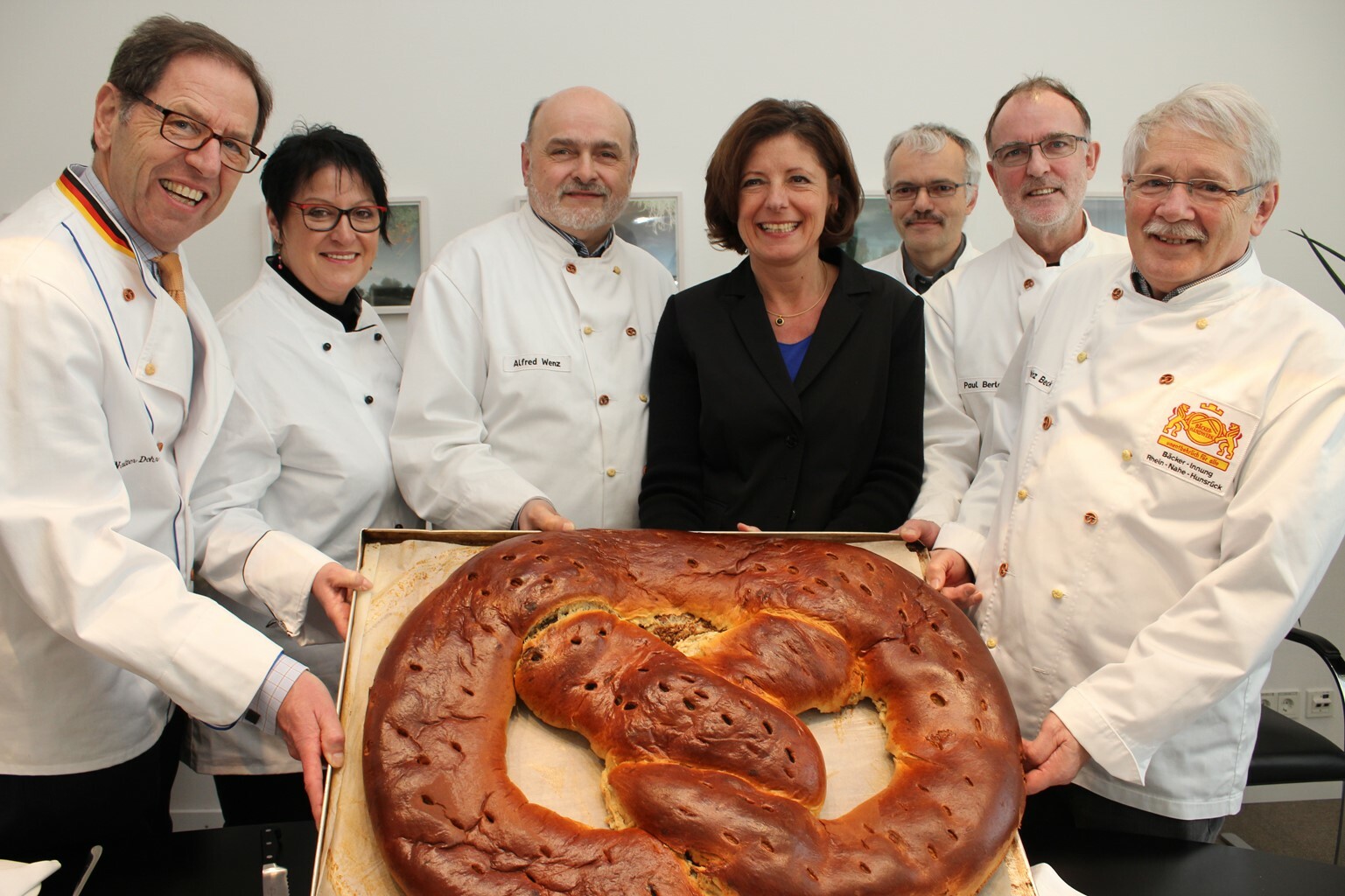 Das leckere Symbol für Glück und Gesundheit hatten Obermeister Alfred Wenz von der Bäckerinnung Rhein-Nahe-Hunsrück wieder nach Mainz gebracht, unterstützt von seinen fleißigen Bäckerkollegen – und diesmal sogar einer Bäckermeisterin. Neben Karl-Heinz Beck (Allenfeld), Paul Betgen (Mastershausen), Michael Roller (Mengerschied) hatte der Bundenbacher Wenz auch Astrid Hofmann aus Schwollen mit gebracht. Walter Dohr vom Verband des Rheinischen Bäckerhandwerks war extra aus Düsseldorf angereist, um sich bei der rheinland-pfälzischen Ministerpräsidentin für die Wertschätzung seines Handwerks zu bedanken: „Mit der Verleihung des Landesehrenpreises für Bäcker sind Sie Vorbild!