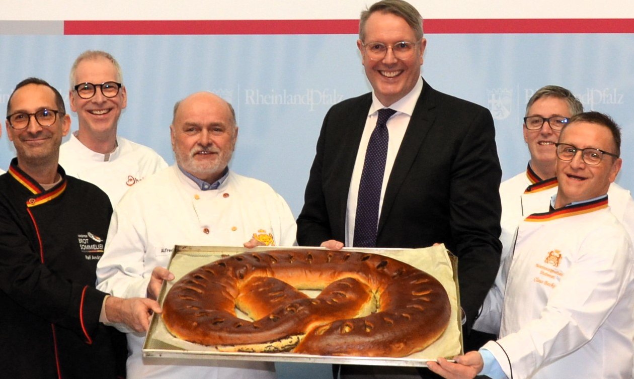 Wie es im Kinderreim heißt: „Prost Neijohr, e Brezel wie ein Scheuertor. Da werden alle gar davon satt.“ Gut 20 Pfund wog das leckere mit Mohn, Nuss und Marzipan gefüllte Backwerk, das der Vorsitzende Kreishandwerksmeister frisch und warm aus dem Backofen seiner Bäckerei in Bundenbach an Ministerpräsident Schweitzer und sein erwartungsvolles Team überreichte.