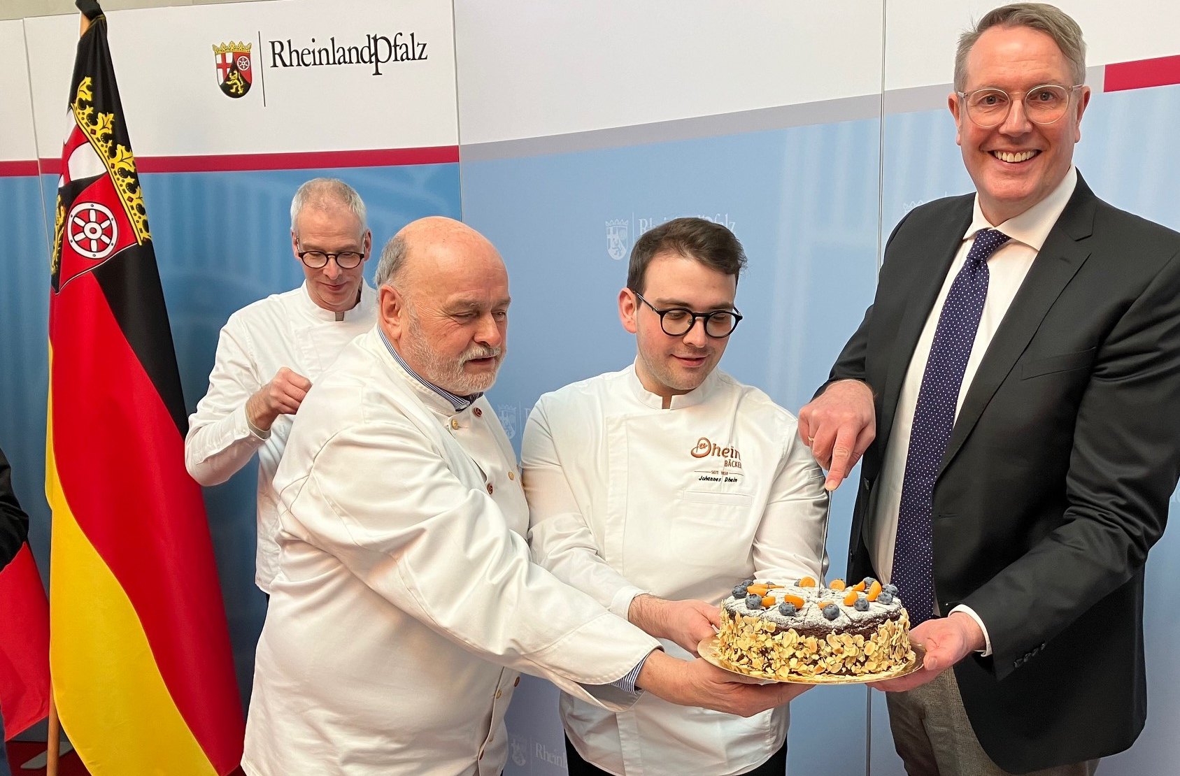 Über eine leckere Überraschung freute sich der Ministerpräsident besonders. Johannes Dhom und sein Vater und stellvertretender Innungs-Obermeister Heinrich-Jürgen Dhein hatten für Alexander Schweitzer eine vegane Schokoladen-Torte mitgebracht, die Schweitzer gerne kostete. Bei der Brezel beließ er es damit, ihn zu portionieren. Weitere Backwaren brachte Obermeister Becker (Edenkoben) mit regionalen Broten mit, und es gab etliche Tüten mit Rosinenbrötchen für die über 70 im großen Saal angetretenen Sternsinger aus den vier Bistümern des Landes. Schweitzer dankte herzlich, erzählte aus Kindheitstagen und Erfahrungen als Messdiener und Sternsinger und lobte im großen Rahmen Lob für die Bäcker und ihre Mitbringsel. Mit Neujahresbrezel („Danke, lieber Alfred“) und Sternsingeraktion seien gleich zwei Traditionen vereint, die bezeugten, dass man aneinander denke. Den Aufruf der Sternsinger für Kinderrechte (Beteiligung, Bildung, Gesundheit, Spiel und Schutz vor Krieg) wertete Schweitzer als wertvollen Fingerzeig, dass auch landesweit gleich gute Medizinversorgung und Pflege wichtig sei und Deutschland international Verantwortung übernehmen solle.