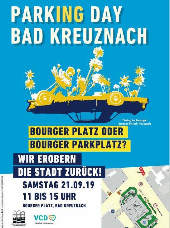 Zur Kreuznacher Premiere 2018 verwandelte der „Parking Day“ die sonst stark befahrene Viktoriastraße in einen grünen und möblierten Treffpunkt für die Bewohner des Pariser Viertels. Diesmal soll der Bourger Platz von den Bad Kreuznachern zurückerobert werden. Unter dem Motto „Bourger Platz oder Bourger Parkplatz?“ entsteht in diesem Jahr mit bunten Ständen, Blumenkübeln und farbigem Bodenbelag ein Platz für alle, die diesen zentralen Ort in der Stadt als Lebensraum erleben wollen. „Ich hoffe, dass wieder viele Menschen teilnehmen und ich motiviere alle, sich einzubringen“, wirbt Oberbürgermeisterin Dr. Heike Kaster-Meurer für die Veranstaltung. Auf den Aktionsräumen am Bourger Platz erwarten die Besucher Infostände, Musik und selbstgemachte Waffeln, aber auch Mitmach-Angebote wie kreatives Bauen mit 10 000 hölzernen Bauklötzen oder eine Murmelbahn für Kinder. „Platz ist genug da, wer eine Idee hat, ist eingeladen, sie zu verwirklichen“, sagt Pia Hilgert, VCD. Um 12 Uhr startet vor Ort außerdem die „Rollparade“, ein Umzug mit Spezialfahrrädern und einem Team von Rollstuhlrikschas und Dreirädern der Kreuznacher Diakonie. Beim Parking Day geht es aber auch um grundsätzliche Fragen. „Wir machen darauf aufmerksam, dass man aus Parkplätzen auch einen Park und einen Platz machen kann“, erklärt Hilgert. Die Stadt Bad Kreuznach und der VCD wollen sich damit für eine Verkehrswende einsetzen und hoffen mit Aktionen wie diesen, ein Zeichen gegen den Klimawandel zu setzen. Hintergrund: Der Parking Day ist ein seit 2005 international jährlich begangener Aktionstag zur Re-Urbanisierung von Innenstädten. Bereiche des öffentlichen Straßenraums werden dabei modellhaft kurzfristig umgewidmet ? etwa als grüne Oase, Gastronomie- und Sitzfläche oder Fahrradabstellfläche. Der Parking Day 2019 findet im Rahmen der 18. Europäischen Woche der Mobilität (16. bis 22. September) statt. Mehr als 2 000 Kommunen in ganz Europa und über 50 Städte und Gemeinden in Deutschland beteiligen sich mit diversen Programmen. Bürger können so mehr über nachhaltige Mobilität erfahren und viele neue Angebote ausprobieren. Nähere Info unter www.umweltbundesamt.de/europaeische-mobilitaetswoche.