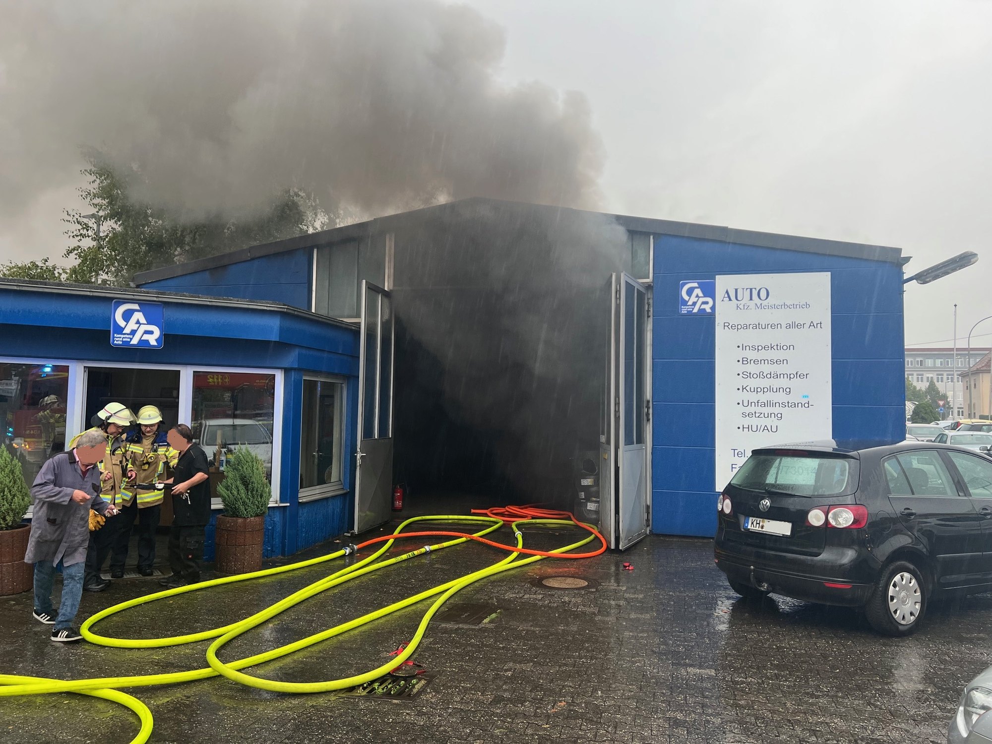 An der Rückseite der Werkstatthalle war ein Pkw in Brand geraten. Dichter schwarzer Rauch drang aus dem Hallentor, und hinter den Fenstern war Feuerschein zu sehen. Mitarbeiter versuchten zunächst, den Brand mit drei Feuerlöschern einzudämmen, mussten jedoch aufgeben. Sie verließen wegen der starken Rauchentwicklung die Halle – eine richtige Entscheidung, wie Feuerwehrsprecher Alexander Jodeleit betont.