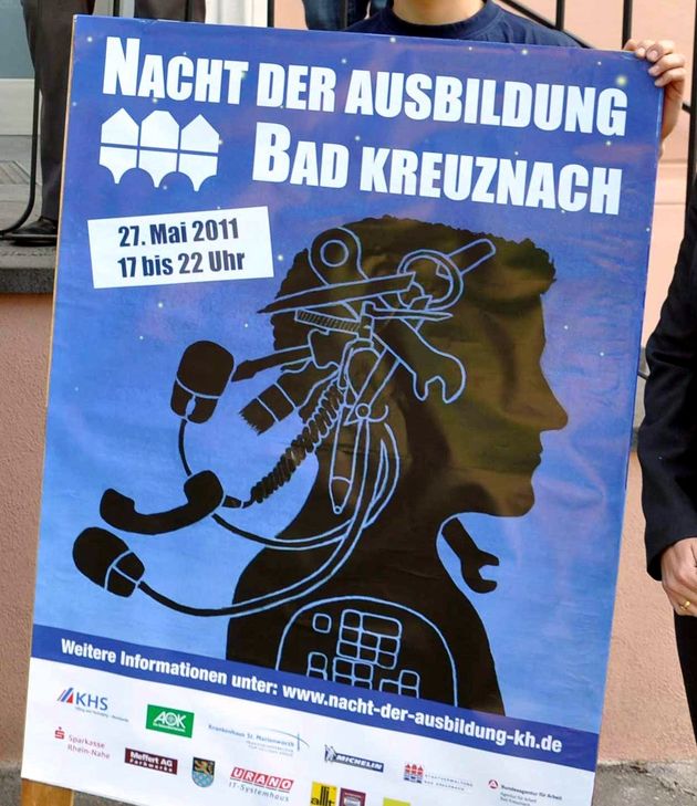 Aus Anlass der Jubiläumsveranstaltung soll nun das Layout für die Plakate und Flyer neu überarbeitet werden und zwar von „jungen Menschen, die am besten wissen, was Gleichaltrige anspricht“, so Wirtschaftsdezernent Udo Bausch. Gemeinsam mit den beteiligten Firmen rufen die Wirtschaftsförderung der Stadt Schulklassen auf, sich an dem Wettbewerb zu beteiligen. Die Motivwahl ist frei. Der Entwurf sollte entweder per Hand gezeichnet oder mit dem Programm Gimp oder Photoshop gestaltet sein (Auflösung 300dpi). Für den Sieger gibt es 500 Euro für die Klassenkasse. Die Nutzungs- und Vermarktungsrechte gehen an die Interessengemeinschaft „Nacht der Ausbildung“ über, die das Preisgeld in Höhe von 500 Euro sponsert. Vorschläge bis zum 15. Januar 2017 nimmt Susanne Weinand, Wirtschaftsförderung, entgegen: susanne.weinand@bad-kreuznach.de oder unter Telefon 0671/800-357 (Fax: 756). Neue Unternehmen, die sich an der Nacht der Ausbildung beteiligen wollen, können sich dort ebenfalls melden. Foto: Das bisher benutzte Motiv für die "Nacht der Ausbildung".