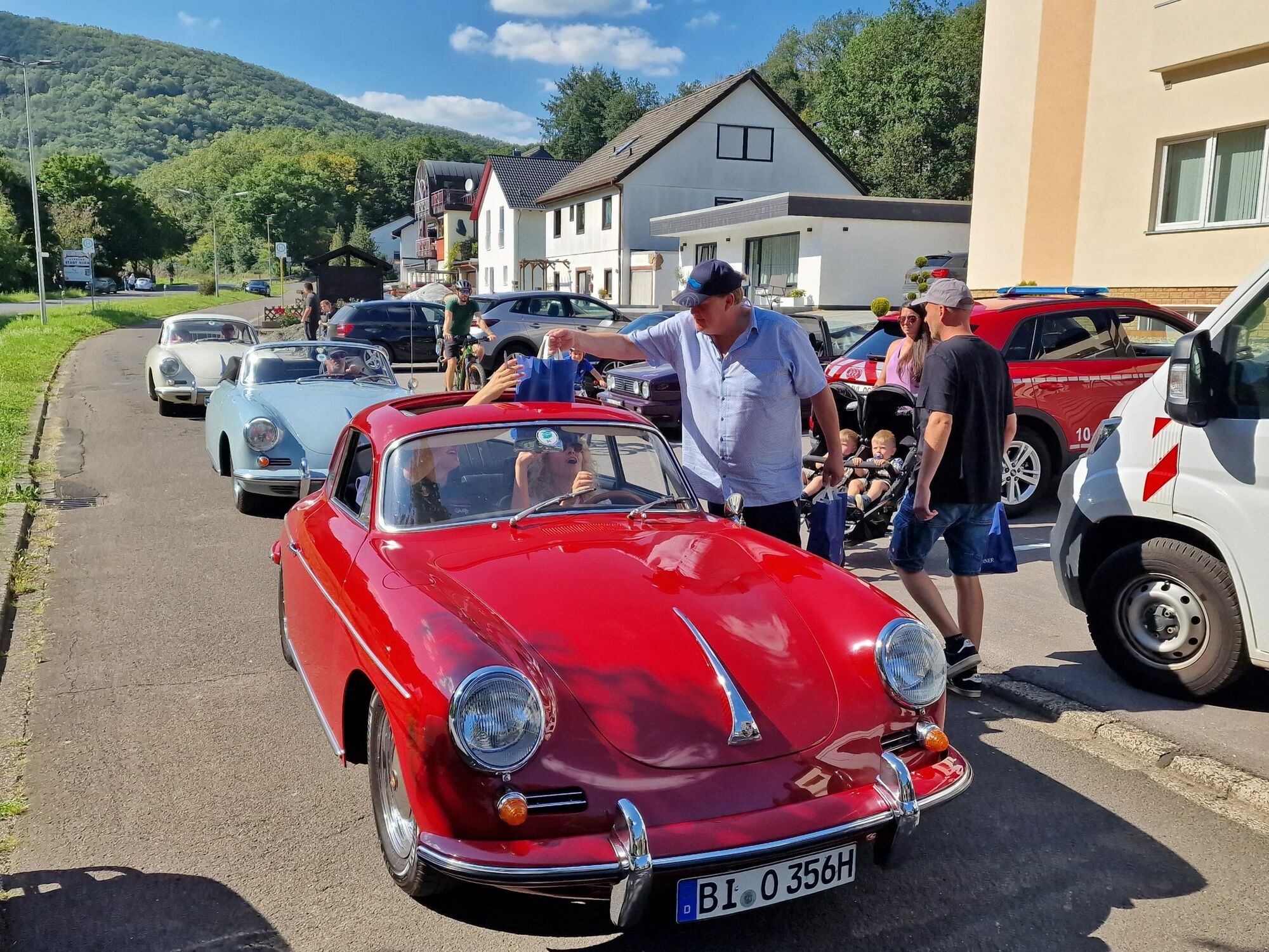 Über 100 Porsche-Oldtimer wurden bei ihrer Hunsrückausfahrt in Kirn feierlich in einer Boxengasse begrüßt. Über 200 Mitglieder des Porsche 356 Clubs aus ganz Deutschland fanden sich am Samstag zur gemeinsamen Ausfahrt ein, um ihre Leidenschaft zu einem der bekanntesten Sportwagen der Welt zu teilen. Mit etwa 100 Porsche 356 machte der Club am 9. September eine Ausfahrt durch die Region, dabei stand das Rheinland-Pfälzische Freilichtmuseum in Bad Sobernheim und die Stadt Kirn auf der Route. In Kirn hatte Stadtbürgermeister Frank Ensminger, Bauhofleiter Heiko Kaiser und Oldtimer-Fan Sven Muser eine Willkommens-Boxengasse mit Fans und Präsenten vorbereitet.