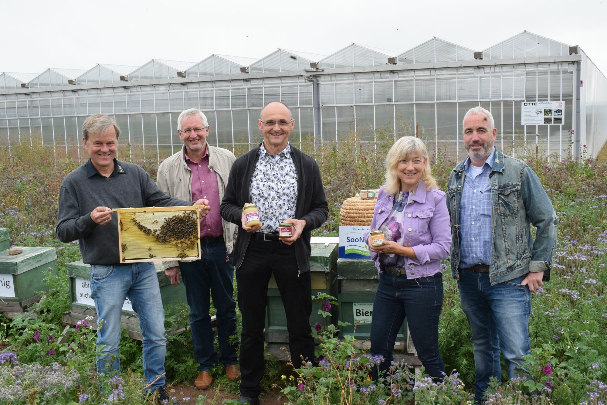 Ein wichtiger Beitrag für den Bienen- und Insektenschutz sowie die Biodiversität leistet seit kurzem die Familiengärtnerei Rehner. Im vergangenen Sommer wurde in Zusammenarbeit mit der Imkerfamilie Rabold aus Hargesheim rund um das neue Rehner-Gewächshaus in Bretzenheim eine 1,3 Hektar große Wildblumenwiese gepflanzt. Dort sammeln die Bienenvölker von Imkerfamilie Rabold fleißig Nektar.(Siehe dazu auch das WochenSpiegel-VIDEO!) Ab dem kommenden Jahr wird es den regional erzeugten Honig von der Rehner-Wiese, der zudem das Logo der Regionalmarke SooNahe trägt, im Gartencenter zu kaufen geben – und das in Pfandgläsern. Und ein weiteres Projekt für den Artenschutz ist bereits geplant: Zukünftig ist eine 0,3 Hektar große Fläche vorgesehen, die Reptilien wie Eidechsen aber auch Igeln und Kriechtieren einen Lebensraum bieten soll. Die Produktion im neuen Gewächshaus in Bretzenheim wird vom Inhaber Karl Rehner gemeinsam mit seinem Sohn Tobias geleitet. Sie beschäftigen drei weitere Mitarbeiter an diesem Standort. Im Oktober 2018 wurde der Bau der großen Gewächshaus-Anlage genehmigt, bereits Ende April 2019 konnten dann erste Pflanzen eingetopft werden. Seither werden hier Blumen, Kräuter, Gräser und Gemüsepflanzen für die nur drei Kilometer entfernte Verkaufsstelle in Bad Kreuznach produziert. Die Familiengärtnerei ist SooNahe-Mitglied und achtet deshalb auf eine umweltschonende Produktion. So arbeiten die geschlossenen Bewässerungssysteme ausschließlich mit Regenwasser. Die Pflanzen werden in einem torfreduzierten Topfsubstrat gezüchtet, welches zur Hälfte aus Holzfasern und Naturton besteht. Außerdem bestehen die „Töpfe“, in denen die Pflanzen zum Verkauf angeboten werden, aus 100 Prozent recyceltem Plastik und können nach dem Einpflanzen wieder beim Gartencenter abgegeben werden.