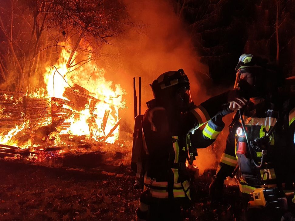 Trotz schnellen Eingreifens konnten die Feuerwehrleute das Gebäude nicht mehr retten. Als die Helfer gegen 3 Uhr früh am Brandort eintrafen, stand das Haus bereits in Vollbrand. Mitarbeiter des in direkter Nachbarschaft liegenden DRK-Seniorenzentrums hatten den Feuerschein zuvor entdeckt und den Brand Einsatzleiter Martin Barth setzte zwei Atemschutztrupps mit zwei C-Rohren zur Brandbekämpfung ein und ließ die Einsatzstelle ausleuchten. Die Löschwasserversorgung wurde von einem Tanklöschfahrzeug hergestellt. Um die Flammen vollständig löschen zu können, wurden die Trümmer eingerissen und auseinandergezogen. Die Polizei Bad Kreuznach war mit zwei Streifenwagen vor Ort und nahm den Brand auf. Die Brandursache ist derzeit noch nicht bekannt. Zu dem nächtlichen Gartenhausbrand waren 24 Einsatzkräfte mit vier Fahrzeugen ausgerückt, die den Einsatz nach rund zwei Stunden wieder beenden konnten.
