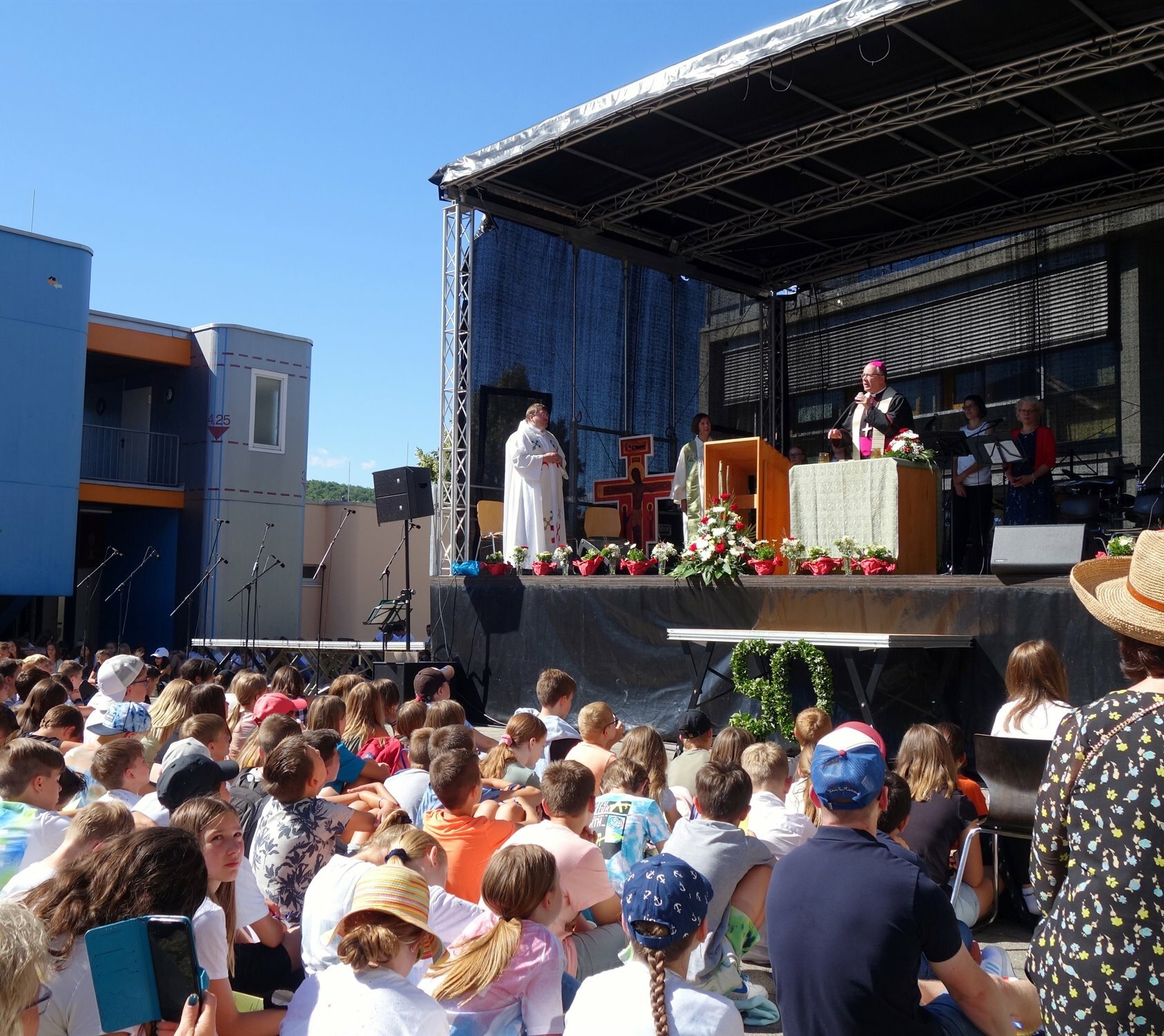 Der Gottesdienst auf dem Schulhof und das anschließende Schulfest standen unter dem Zitat Alfred Delps „Lasst uns dem Leben trauen“ und wurden insbesondere durch viele unterschiedliche musikalische Beiträge bereichert.