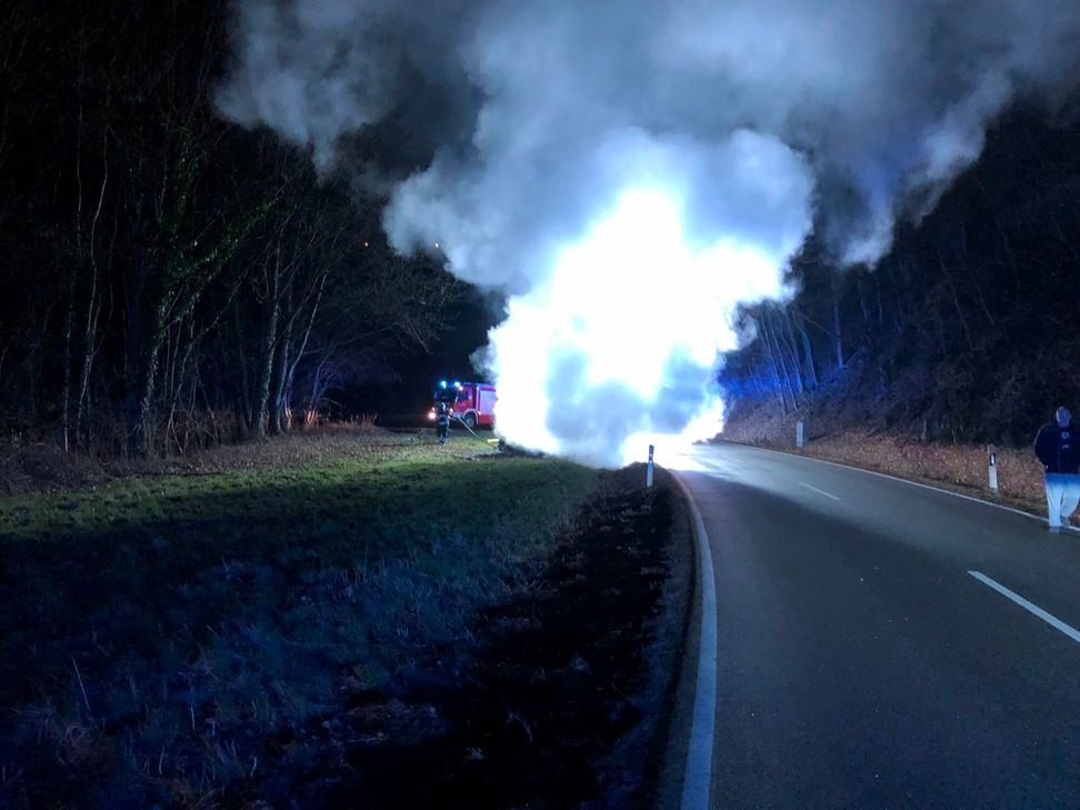 Sein Fahrzeug wurde durch das Feuer völlig zerstört. Die freiwillige Feuerwehr Stromberg war mit zehn Kräften und drei Fahrzeugen vor Ort. Was den Fahrzeugbrand ausgelöst hatte, ist derzeit noch nicht bekannt.