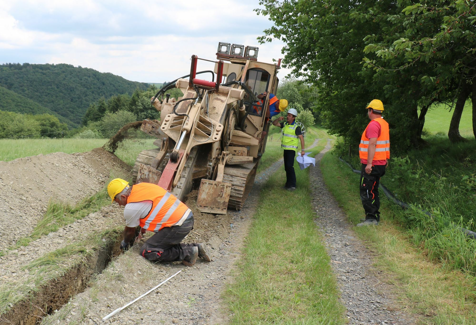 Der Gehörschutz ist parat, der Helm sitzt und die Sicherheitsschuhe sind geschnürt - so kann es los gehen. In erster Linie werden hier Kabel für schnelles Internet verlegt. Im gleichen Zuge wird in diesem Abschnitt aber auch die Mittelspannungs-Freileitung in die Erde verlegt werden.