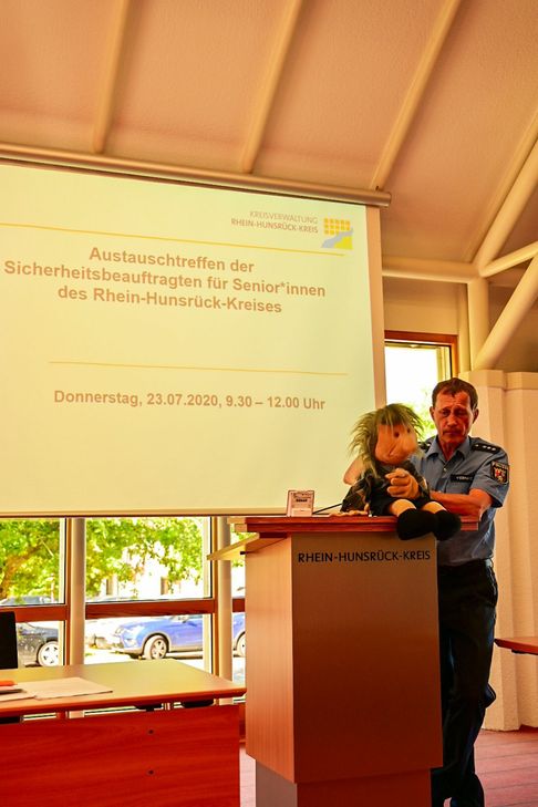Nach der Begrüßung durch Herrn Jung, Geschäftsbereichsleiter bei der Kreisverwaltung, berichteten die Seniorensicherheitsberater von ihren - derzeit nur sehr eingeschränkt möglichen - Aktivitäten und tauschten sich über Möglichkeiten der Informationsweitergabe und weiteren Zusammenarbeit aus. Herr Adams, SfS in der Verbandsgemeinde Hunsrück-Mittelrhein, stellte sein Vortragskonzept (Rollenspiel) vor. Herr Viebranz vom Polizeipräsidium Koblenz überzeugte mit seinem methodischen Ansatz, mittels einer sogenannten „Schoßpuppe“ sicherheitsrelevante Themen zu vermitteln. Sehr eingängig demonstrierte er am Thema „Geld abheben am Bankschalter“ und „Paketannahme für einen Nachbarn“, wie per Puppenspiel nachhaltig für Gefahren durch kriminelles Verhalten sensibilisiert werden kann.