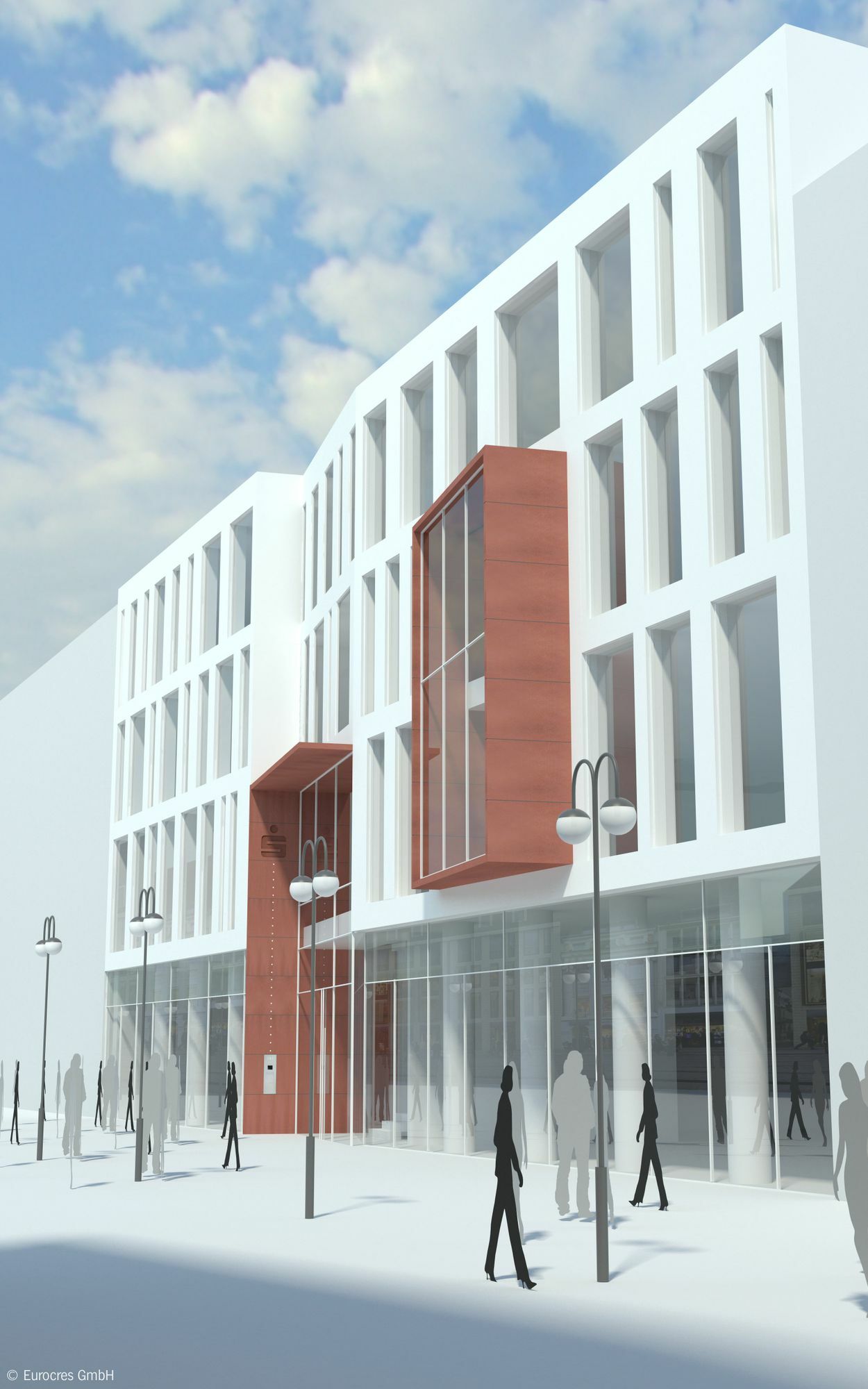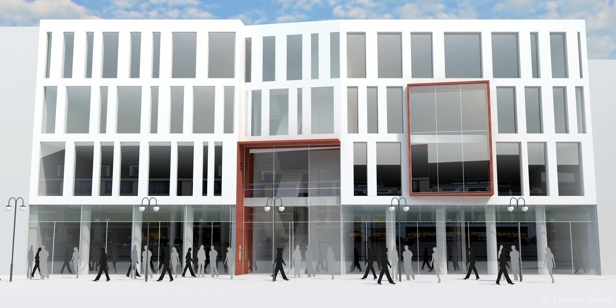 Rund 100 Meter entfernt vom „Immobilienhaus“ zwischen dem Adler und dem Rewe Markt entsteht das „Beratungszentrum Sparkasse“ (zweites Foto) für „Private-Banking“ sowie Unternehmens- und Firmenkunden. Das geplante Gebäude wird viergeschossig errichtet und unterkellert. Die Gesamtfläche (ohne Keller) beträgt rund 6 000 Quadratmeter. „Während im Erdgeschoss vermietete Verkaufsflächen entstehen, dienen die drei Obergeschosse der Sparkasse zur Kundenberatung sowie als Bürofläche für zirka 120 Mitarbeiter. „Für die Flächen im Erdgeschoss liegen sogar schon jetzt Anfragen von interessierten Gewerbetreibenden vor“, so Vorstandsmitglied Steffen Roßkopf. Dies sei ein deutliches Zeichen für die Attraktivität des Handelsstandortes Bad Kreuznach. Im ersten Obergeschoss wird der Kunden-Bereich für die Beratungen einrichtet. Hier liegt auch der Zugang zum Innenhof, um die alle oberen Stockwerke angeordnet sind. Das erste Obergeschoss und der Innenhof sollen sich auch für Ausstellungen und Veranstaltungen nutzen lassen.