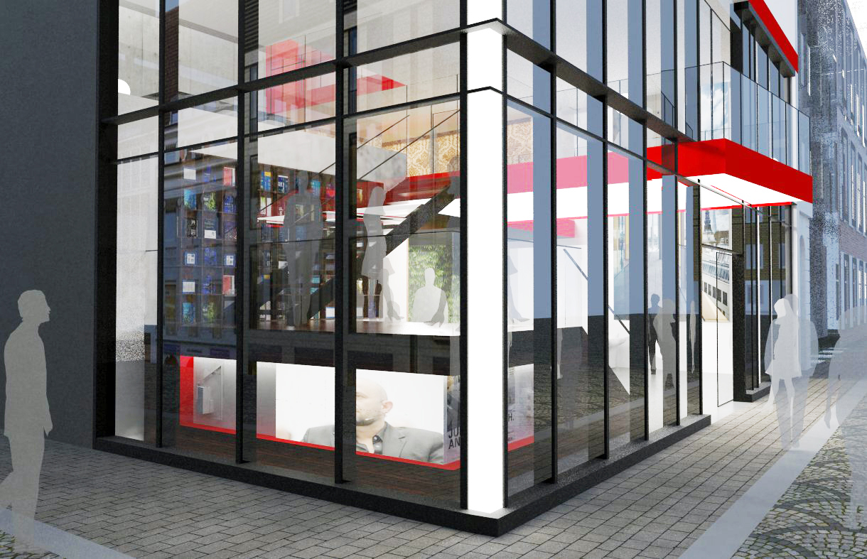 Im Erdgeschoss wird außerdem ein rund um die Uhr zugänglicher großzügiger Selbstbedienungsbereich für Bankgeschäfte eingerichtet, der über einen separaten Eingang zu erreichen ist. Die Filiale und der Selbstbedienungsbereich der Sparkasse am Europaplatz wird geschlossen. Im neuen „Immobilienhaus“ werden rund 30 Mitarbeiter für die Kundenbetreuung zur Verfügung stehen.