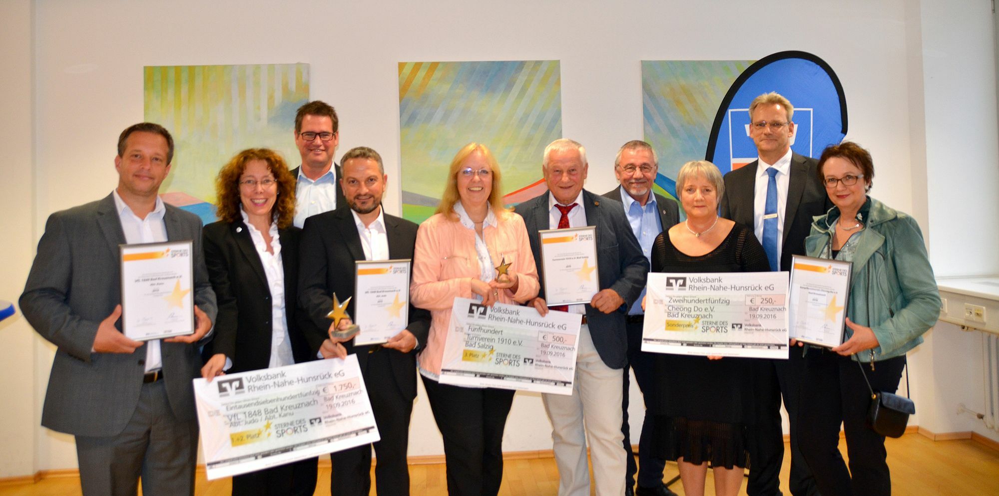 Drei Sterne und ein Sonderpreis wurden in der Bad Kreuznacher Hauptstelle von Regionaldirektor Michael Jöckel feierlich an die anwesenden Vereinsvertreter übergeben. Über den ersten Platz sowie einen großen Stern des Sports in Bronze und ein Preisgeld über 1000 Euro durfte sich die Abteilung Judo des VfL 1848 Bad Kreuznach freuen. Übungsleiter Jürgen Teutsch nahm den Preis für das Projekt „Alle inklusive im VfL Bad Kreuz-nach“ entgegen. Das Projekt wurde 2004 mit dem Ziel ins Leben gerufen, durch die aktive Einbeziehung geistig beeinträchtigter Personen in das tägliche Sportgeschehen nicht nur Akzeptanz im Sportverein, sondern auch in der breiten Öffentlichkeit zu steigern. Platz zwei, verbunden mit einem kleinen bronzenen Stern und einem Preisgeld in Höhe von 750 Euro für sein Projekt „Wiederbelebung des Wettkampfsports im Bereich Jugend der Kanu-Abteilung“ ging an die VfL Kanu-Abteilung. Seit 2010 arbeitet man hier aktiv daran, den Nachwuchs wieder erfolgreich in die Leis-tungsspitze des deutschen Kanuslalomsports zu bringen und die Sportart damit auch für Kinder und Jugendliche attraktiver zu machen. Platz drei sowie einen kleinen Stern und 500 Euro Preisgeld nahm Martina Kohl vom TV 1910 e.V. Bad Salzig entgegen. Der Verein überzeugte die Jury mit einem nicht alltäglichen Sportangebot für Seniorinnen und Senioren, die über 60 Jahre alt sind und seit 2014 gemeinsam Ju-Jutsu trainieren. Über den Sonderpreis und das damit verbundene Preisgeld in Höhe von 250 Euro freuten sich Marion Eckart und Elisabeth Zurmöhle vom Kampfkunstverein Cheong Do e.V. Seit vielen Jahren möchte man im Verein nicht nur Kampfkunst trainieren, sondern durch ein hohes Engagement im Rahmen zahlreicher Projekte auch Tugenden aktiv leben und weiter geben.