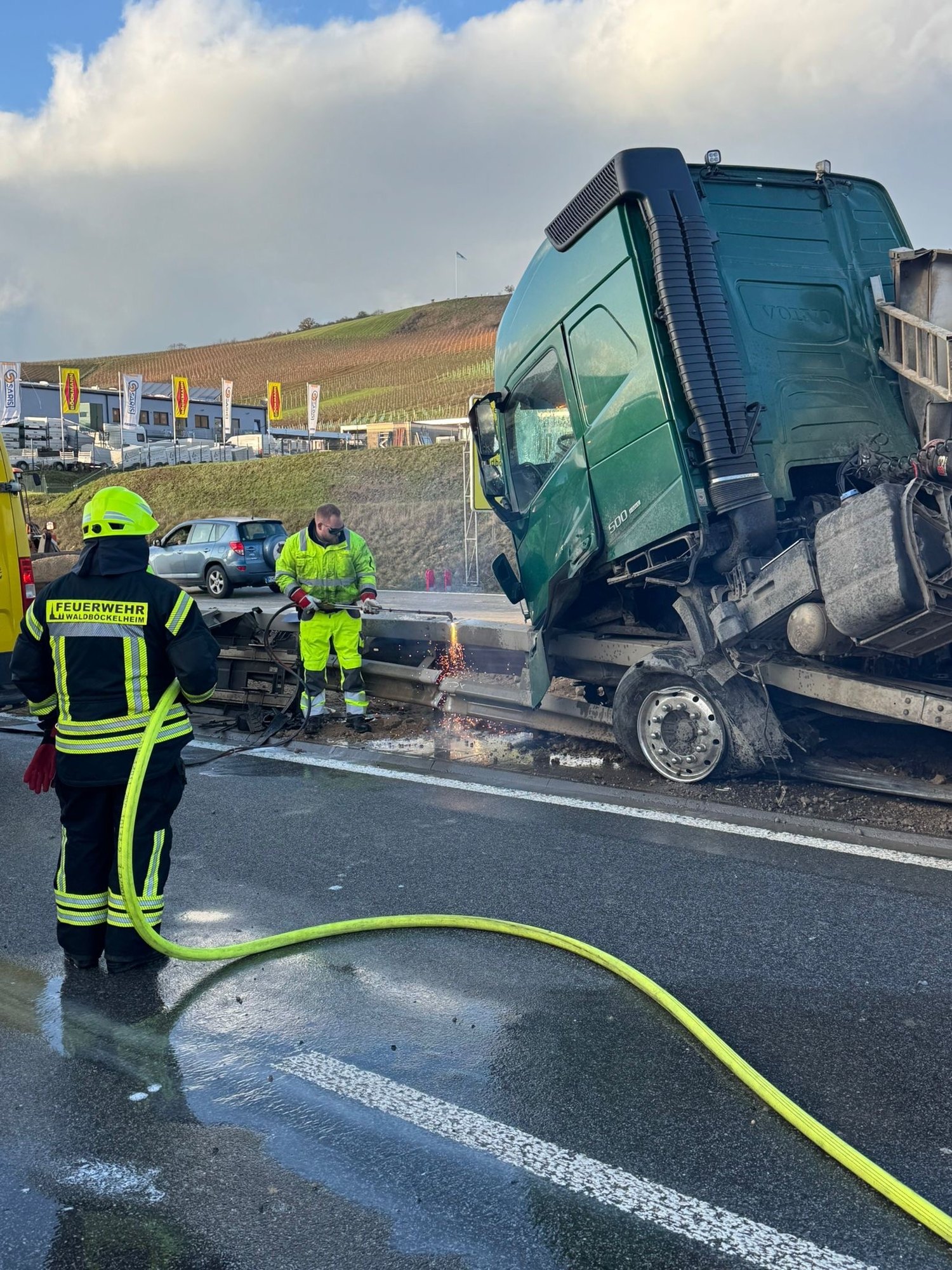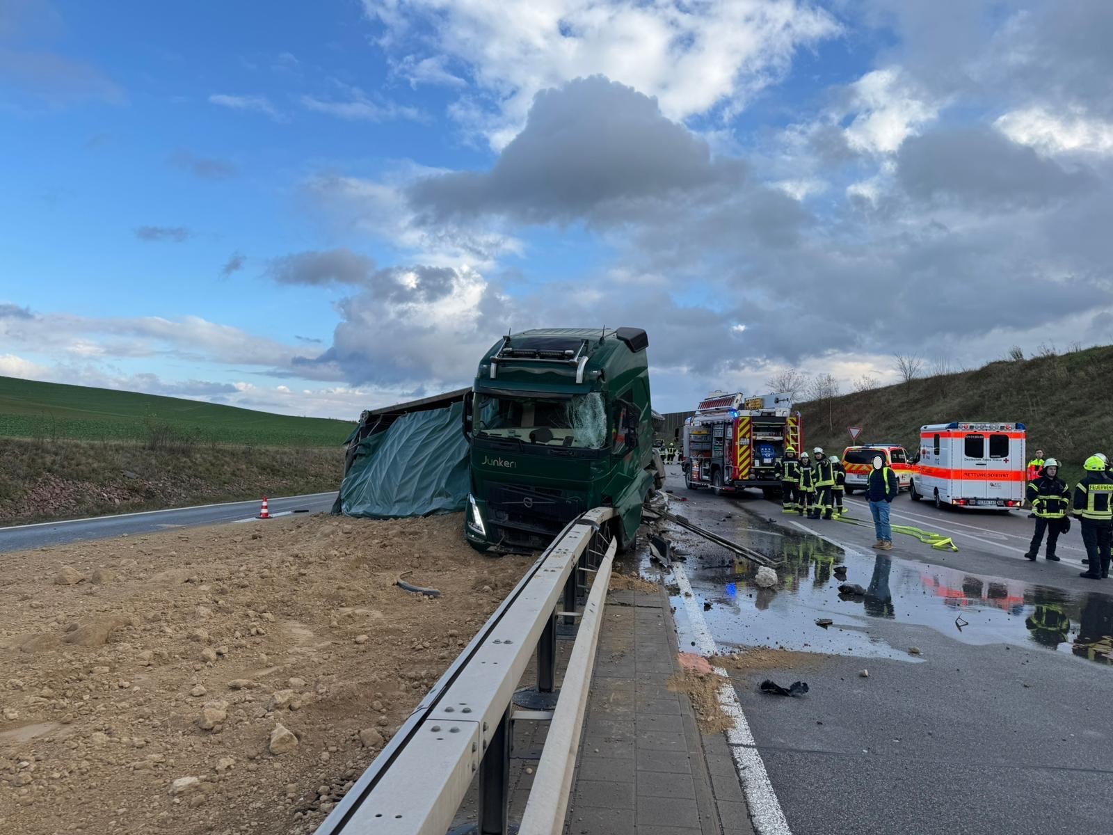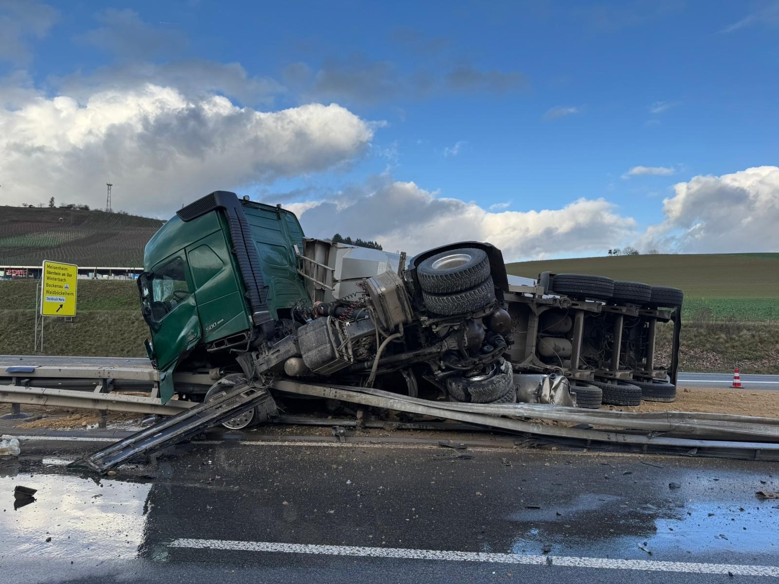 Gegen 13.25 Uhr geriet ein mit 26 Tonnen Erde beladener Sattelzug in Fahrtrichtung Kirn aus ungeklärter Ursache ins Schleudern. Der Lkw kollidierte mit der Mittelleitplanke, der Auflieger kippte um und verstreute die Ladung auf der mehrspurigen Fahrbahn. Die Zugmaschine kam auf der Leitplanke zum Stehen, wobei der Dieseltank aufriss und mehrere Hundert Liter Diesel austraten.
