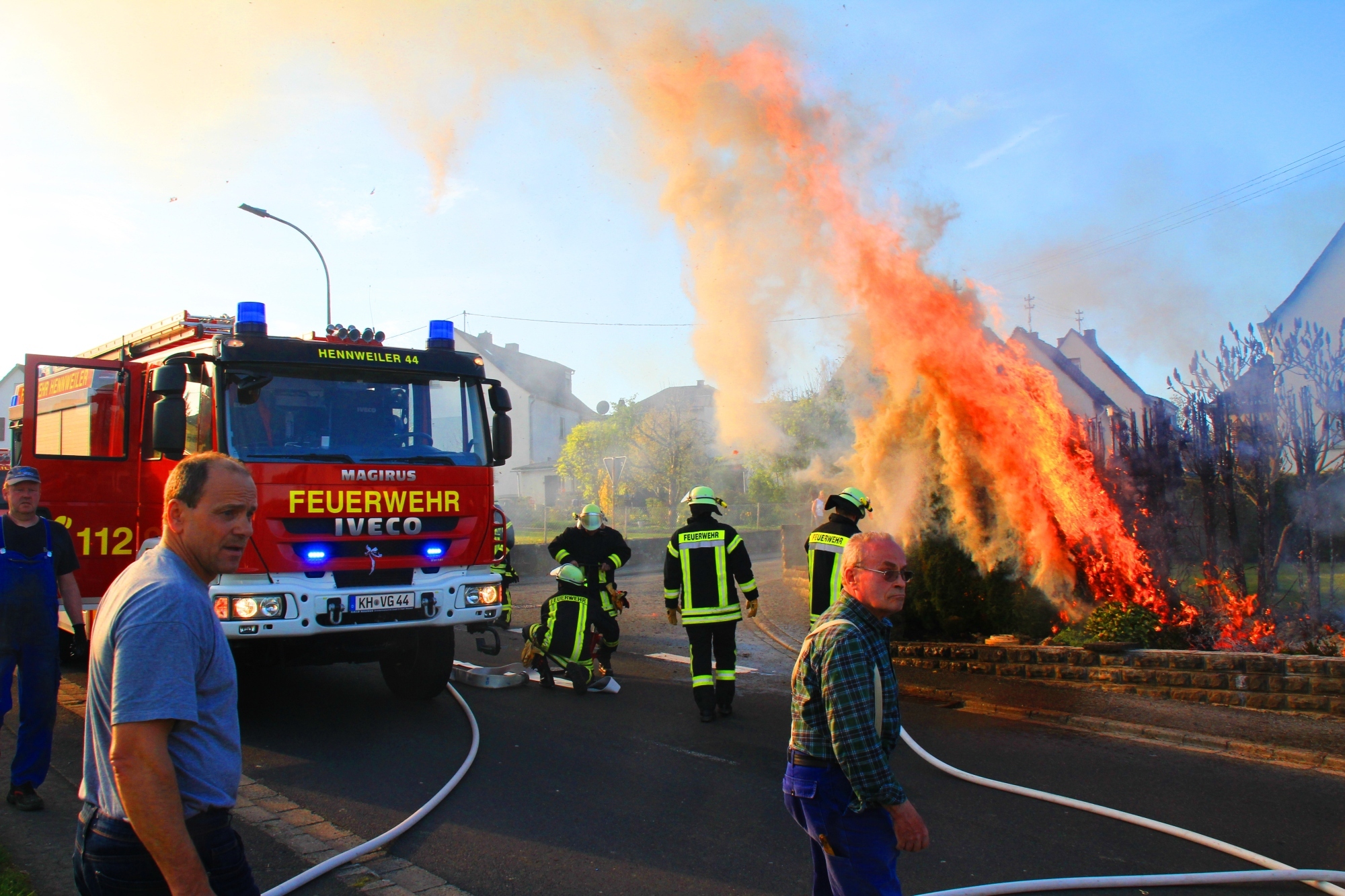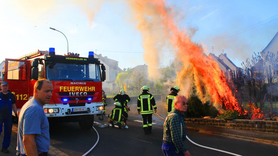 Schreck in der kleinen Ortsgemeinde an der Nahe. Eine Thujahecke ist am Donnerstagabend lichterloh in Feuer aufgegangen. Vorausgegangen war ein Feuer in einem Gasgrill. Zwölf Feuerlöscher wurden von der Dorfgemeinschaft eingesetzt - erfolglos. Schließlich konnte der Brand aber doch noch gelöscht werden. Foto: Schmitt