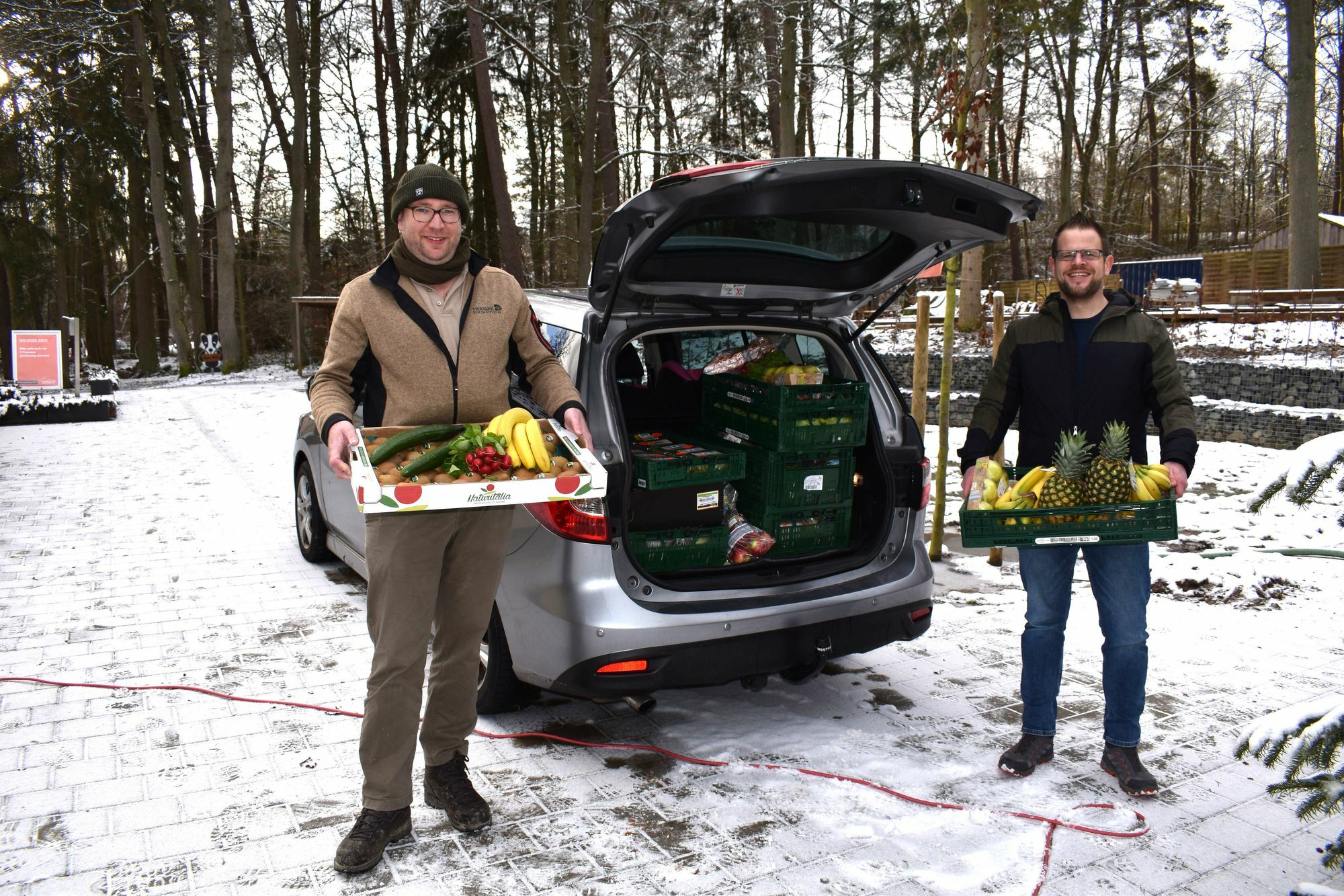 Markus Wüllenweber (rechts) übergibt eine großzügige Futterspende an Kristof Fröhlich vom Tierpark Rheinböllen. (Foto: Andreas Bender)