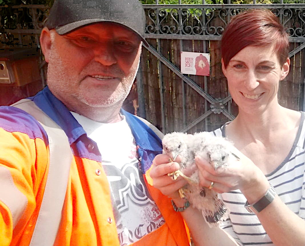 Der Bauhof als Tierfreund und Retter. Dass zwei Turmfalken-Küken wohlbehalten in der Waldalgesheimer-Wildtier-Aufzuchtstation wieder aufgepäppelt werden, haben sie Rüdiger Hanau und Holger Peinemann zu verdanken. In seinem Revierdienst mit dem Hand-Müllsauger entdeckte Hanau die beiden jungen Greifvögel auf dem Gehweg in der Römerstraße. Behutsam nahm er die Tiere in seine Obhut. Da sie das städtische Tierheim nicht aufnehmen konnte, brachte sie Hanaus Kollege Holger Peinemann zu Nadine Müller (Foto), die in Waldalgesheim in ihrer Wild-Tier-Aufzuchtstation sich liebevoll um Findlinge kümmert. Sie schätzt das Alter der beiden Turmfalken auf etwa vier Wochen. Sie weiß, dass die Muttter ihren Nachwuchs nicht mehr gefüttert hätte und er vermutlich ein Opfer von Krähen .Katzen oder Fahrzeugen geworden wäre. “Soll keiner sagen, die Männer vom Bauhof hätten kein Herz für Tiere”, freut sich auch Bürgermeister Wolfgang Heinrich über die tierische Rettungsaktion.