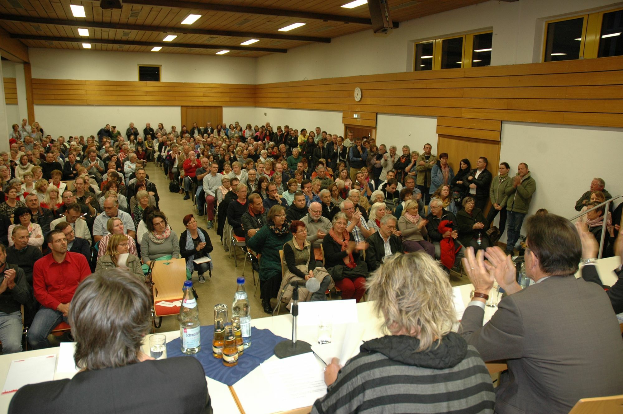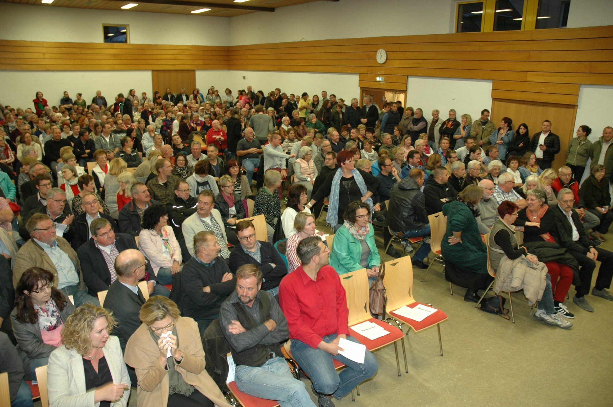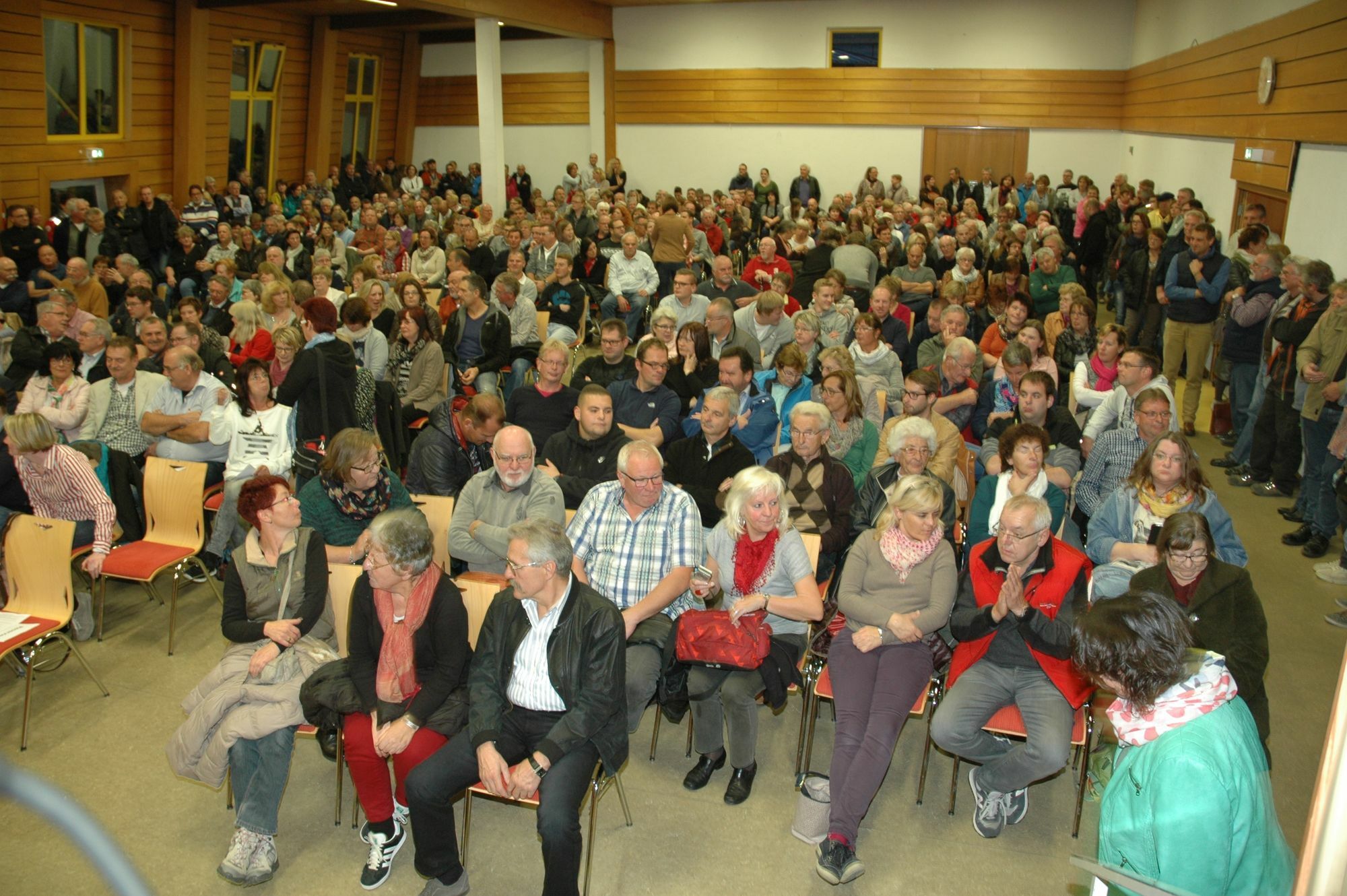 Dicht an dicht und bis hinaus auf den Platz vor der Gemeindehalle drängten sich die Bürgerinnen und Bürger, um mit Integrationsministerin Irene Alt und Vertretern der Kommune über die Flüchtlingsunterkunft zu diskutieren. Der Andrang war kein Wunder, denn der Klärungsbedarf war angesichts der sehr holprigen Informationspolitik des Landes hoch. Anfang Oktober hatten Ortsbürgermeister Wolf und Verbandsgemeindebürgermeister Michael Cyfka über Gerüchte erfahren, dass auf dem ehemaligen Delphi-Werksgelände eine Notunterkunft für bis zu 2500 Personen geplant ist. Erst nach einer weiteren Ortsbegehung mit Flüchtlingskoordinator Detlef Placek entschied das Land, in der Einrichtung nicht mehr als rund 1000 Personen unter zu bringen. "Bei bestimmten Informationen hat das Integrationsministerium noch Luft nach oben", kritisierte Landrat Franz-Josef Diel die missglückte Informationspolitik des Landes.