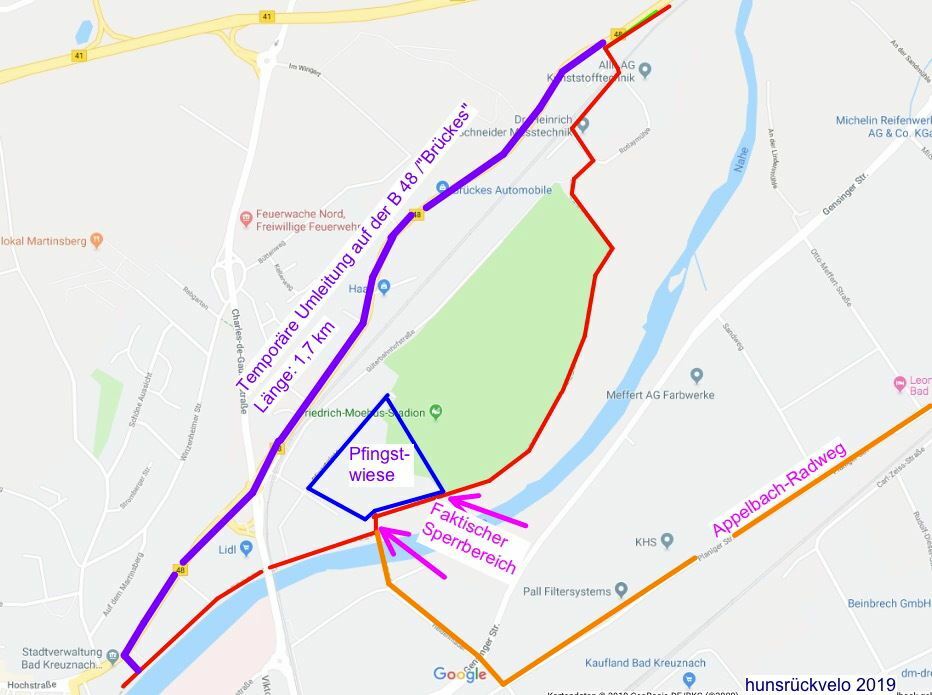 Der Naheradweg, der unmittelbar an der Pfingstwiese vorbeiführt, ist während des Jahrmarkts (16. bis 20 August) erstmals temporär zwischen Magister-Faust-Gasse und Rotlaymühle gesperrt. Fahrradfahrer werden über den Brückes umgeleitet.