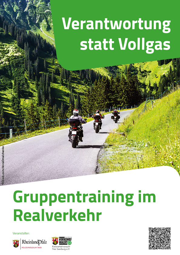 Ein Teil der Präventionskampagne sind Gruppentrainings für interessierte Motorradfahrer. Am Sonntag, 27. September, findet wieder ein solches Motorrad-Gruppentraining als „Training im Realverkehr“ statt. Unter fachkundiger Anleitung von Kradfahrern der Polizei Rheinland-Pfalz und der Kreisverkehrswacht sowie durch mehrere Motorradfahrlehrer der Fahrschule Sauer & Team starten die Teilnehmerinnen und Teilnehmer in kleinen Gruppen.